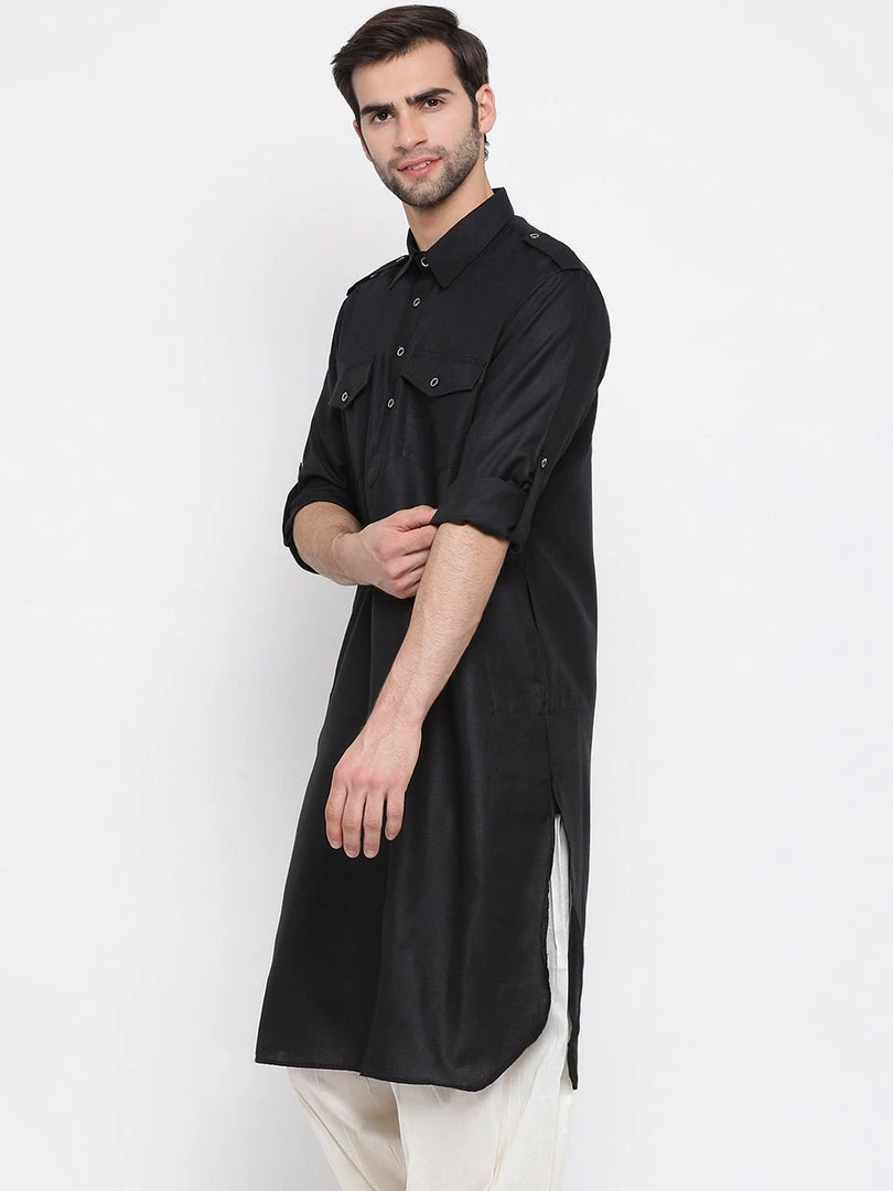 Black straight knee length pathani kurta, has a shirt collar, long sleeves, button placket, curved hem, two pockets and side slits