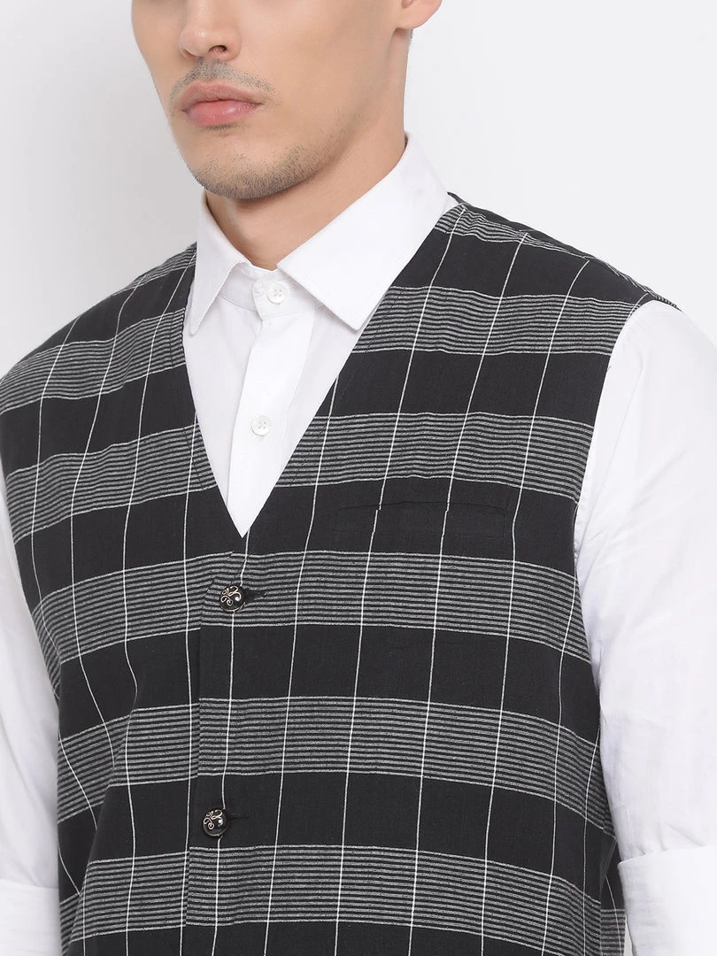 Black and white checked woven Nehru jacket, has V neck, a full button placket, sleeveless, three pockets