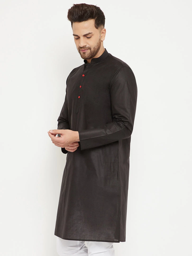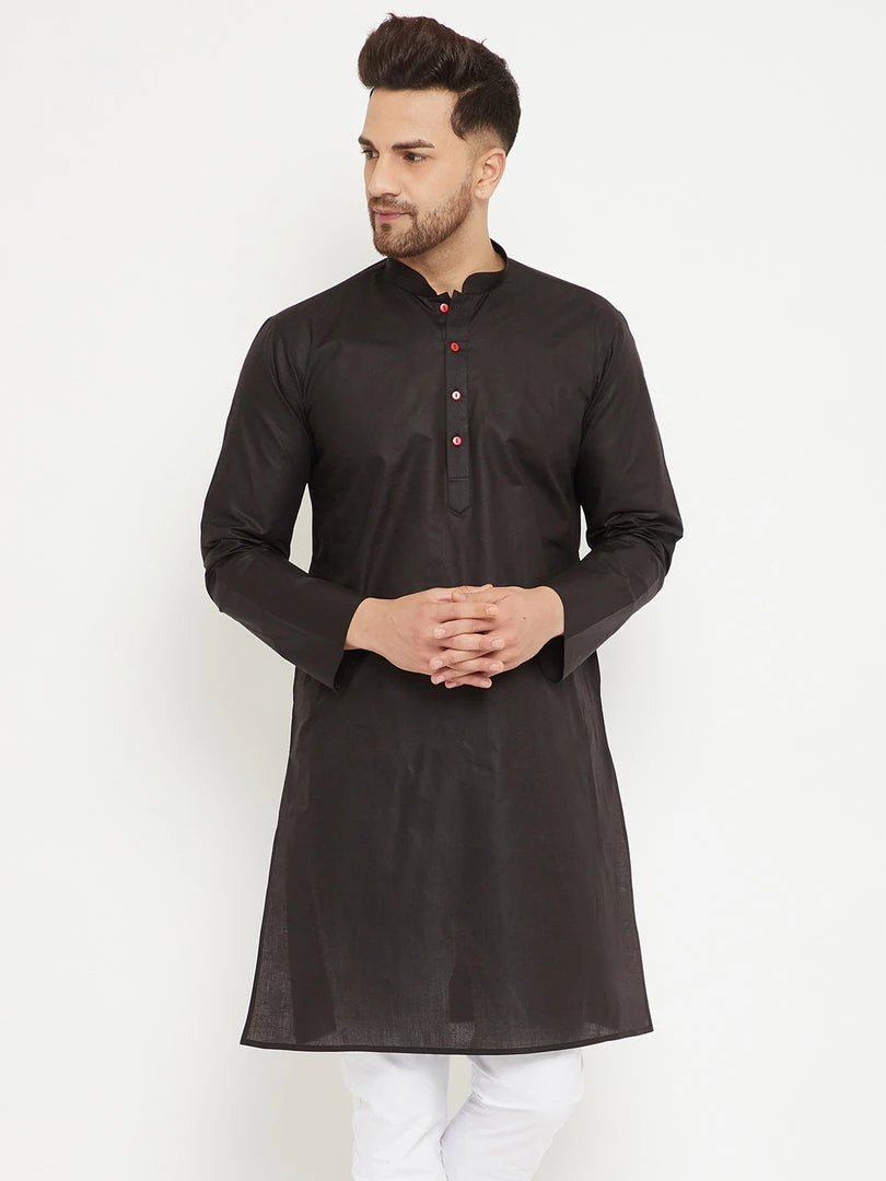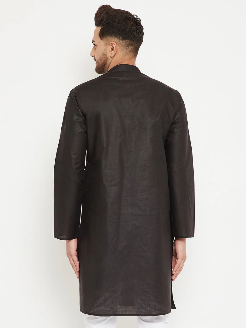 Black Solid straight Knee length kurta, has a Mandarin Collar, button placket, long sleeves, Straight hem, Side slits.