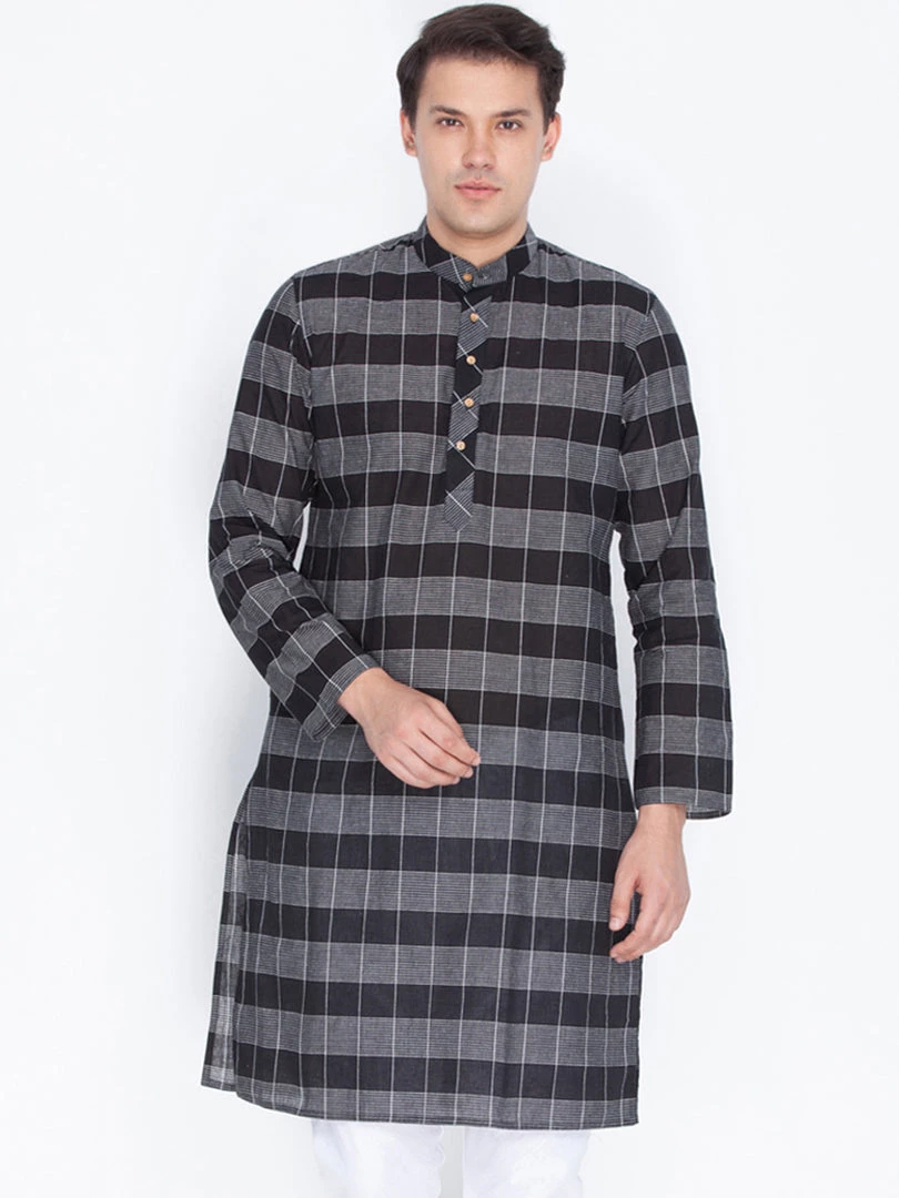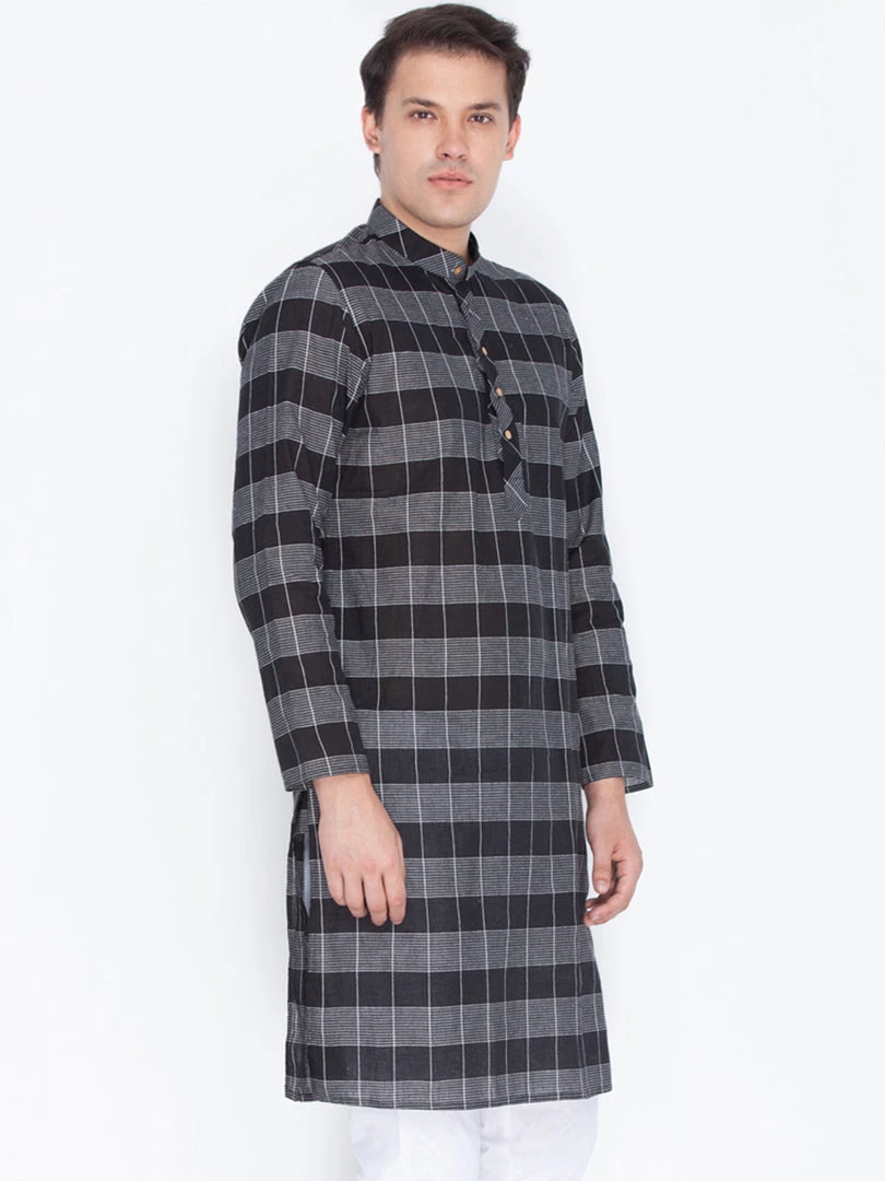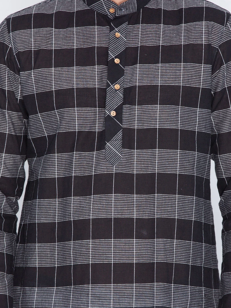 Black and white woven check straight kurta, has a mandarin collar, long sleeves, button placket, straight hem, and side slits