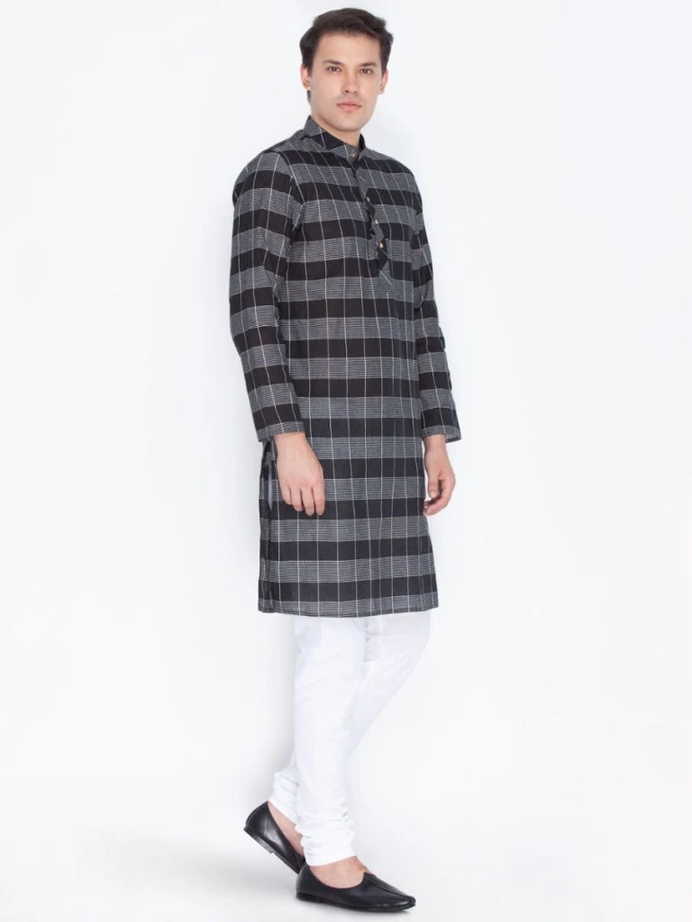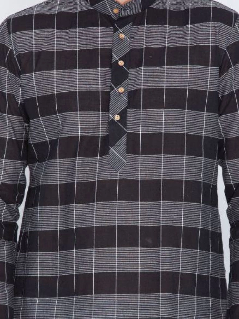 Black and white woven check straight knee length kurta, has a mandarin collar, long sleeves, button placket, straight hem