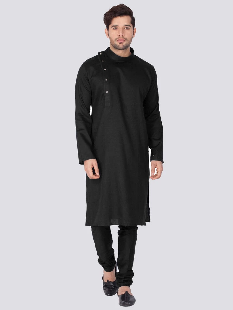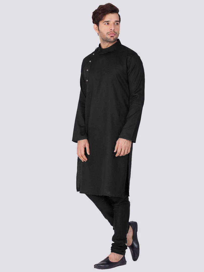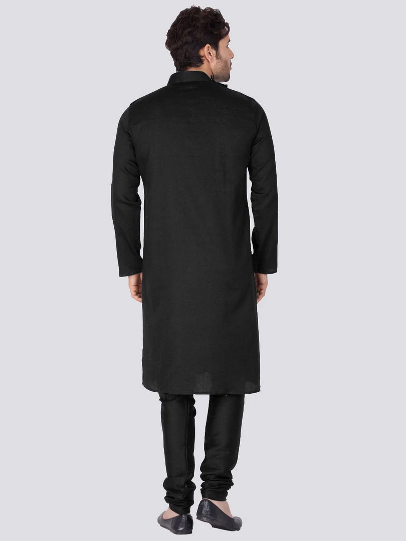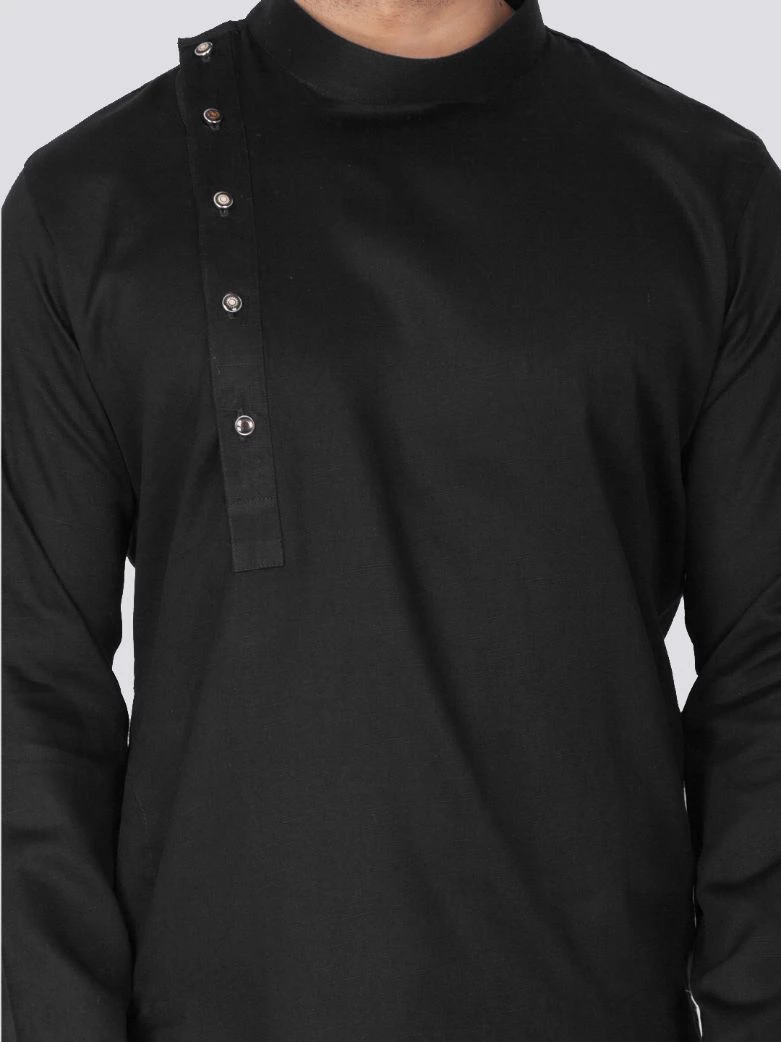 Black solid straight knee length kurta, has a band collar, side button placket, long sleeves, straight hem