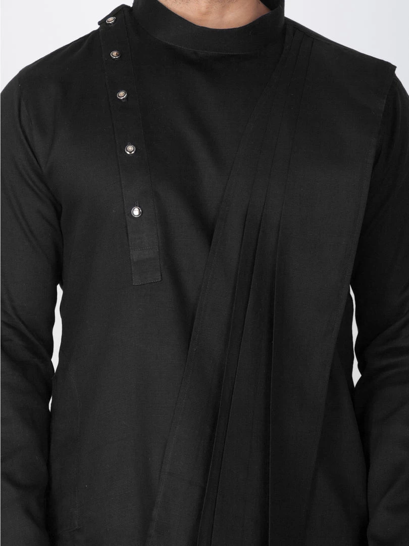 Black layered solid straight knee length kurta, has a band collar, side button placket, long sleeves, straight hem