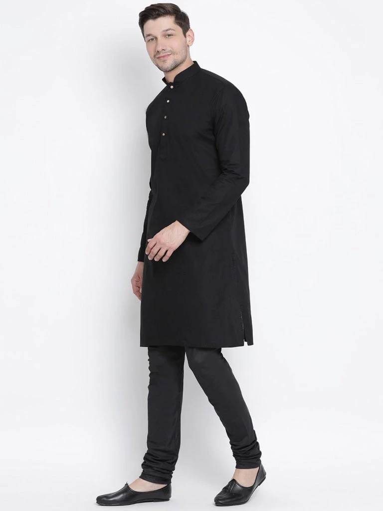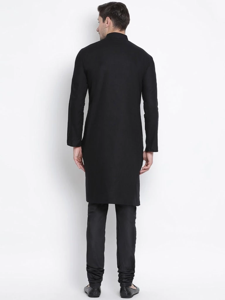 Black solid straight knee length kurta, has a mandarin collar, button placket, long sleeves, straight hem