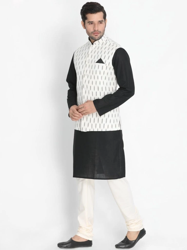 Black solid kurta with solid churidar and white Nehru jacket