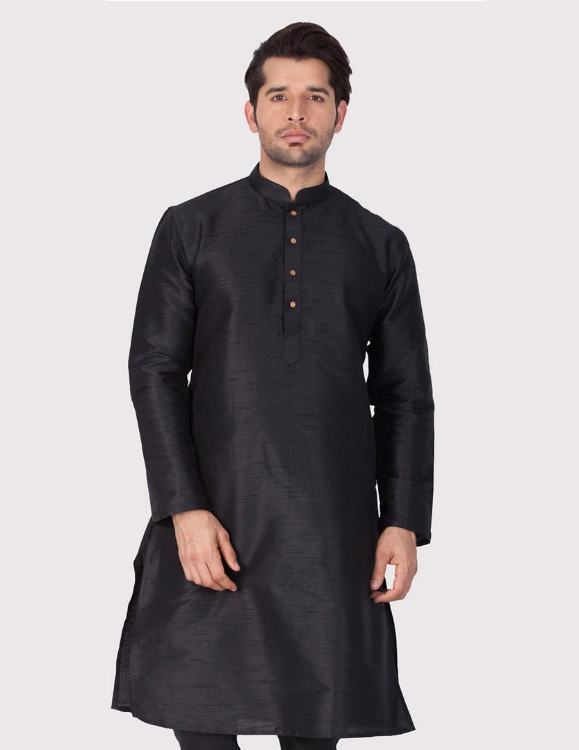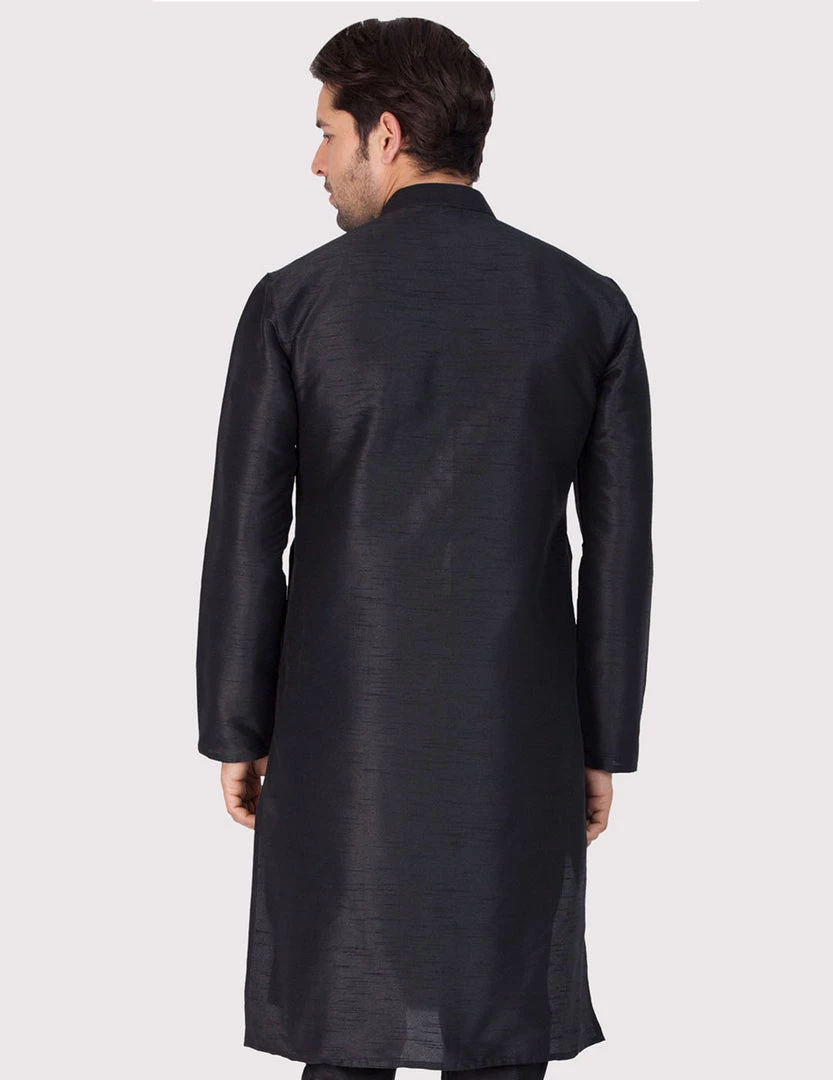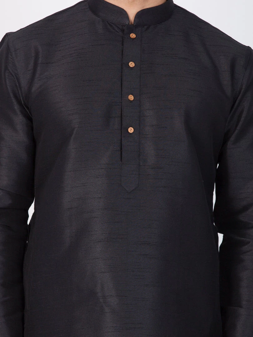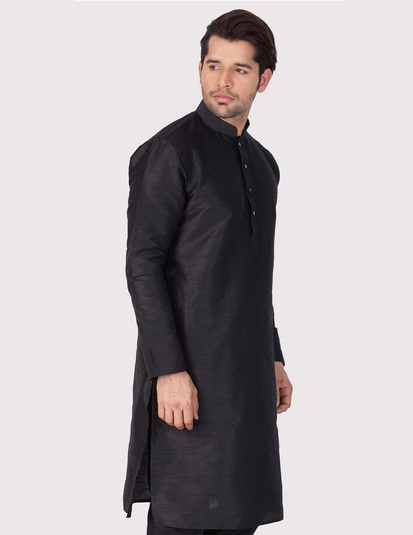 Black solid straight kurta, has a mandarin collar, long sleeves, button placket, straight hem, and side slits.