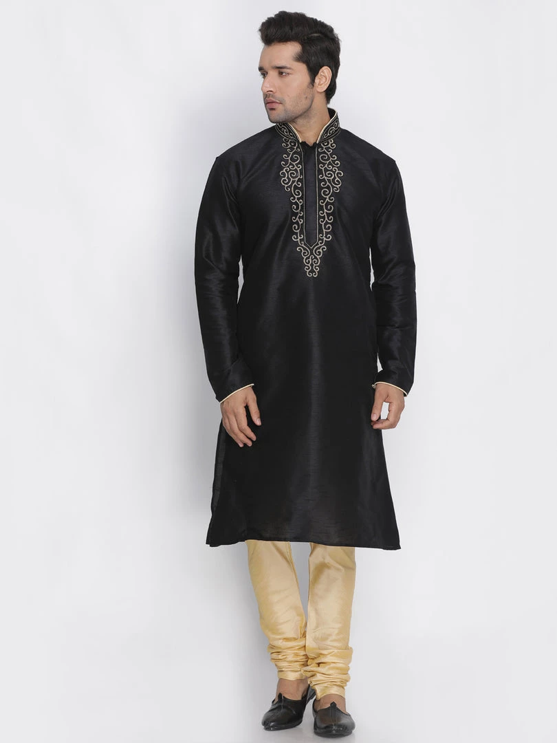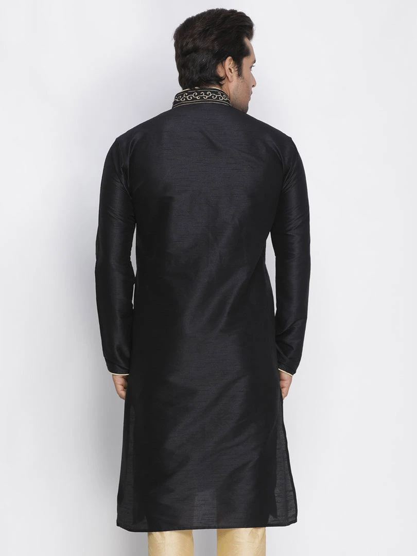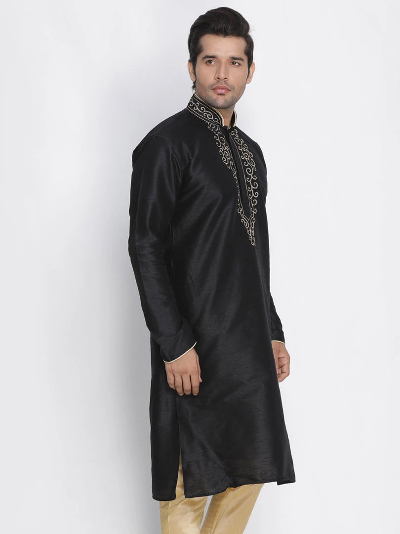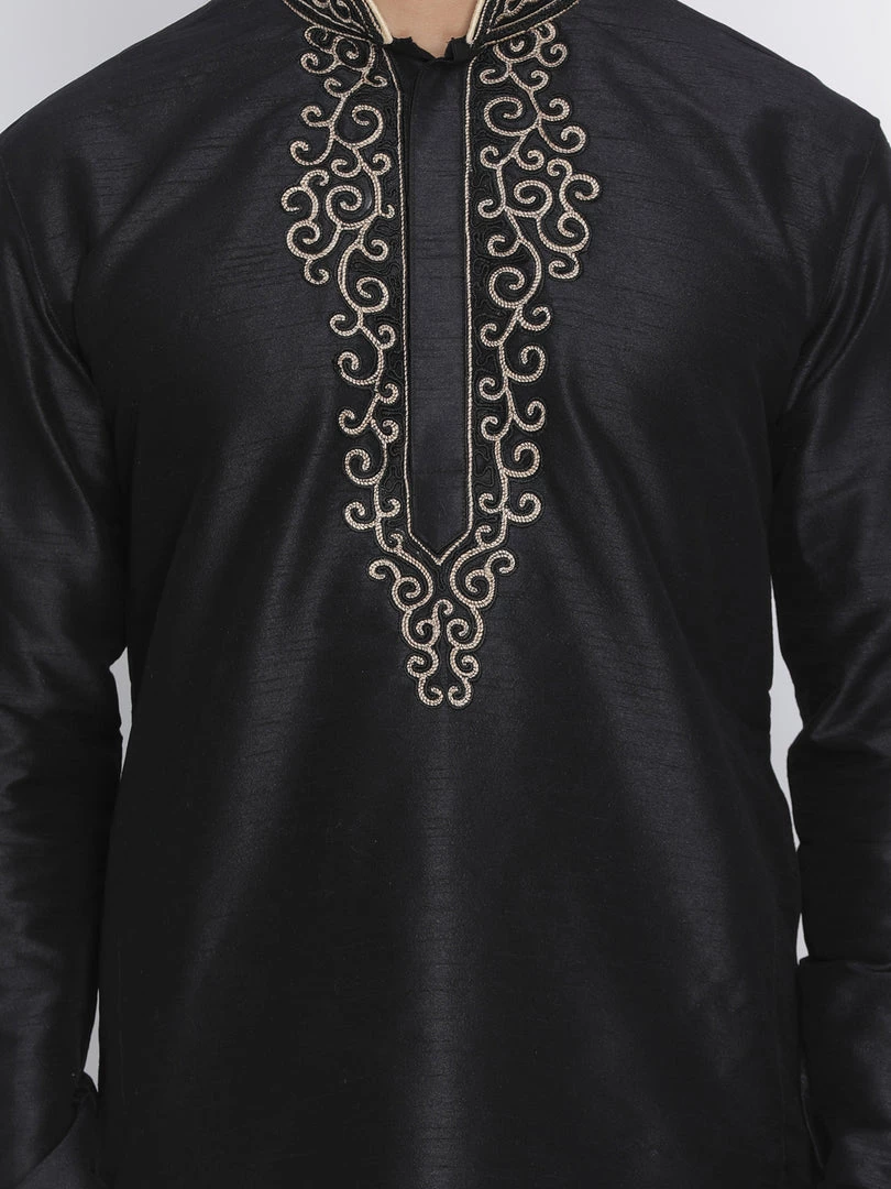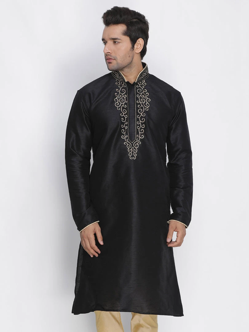 Black solid straight kurta, has a mandarin collar, long sleeves, straight hem, detailing around collar and placket and side slits