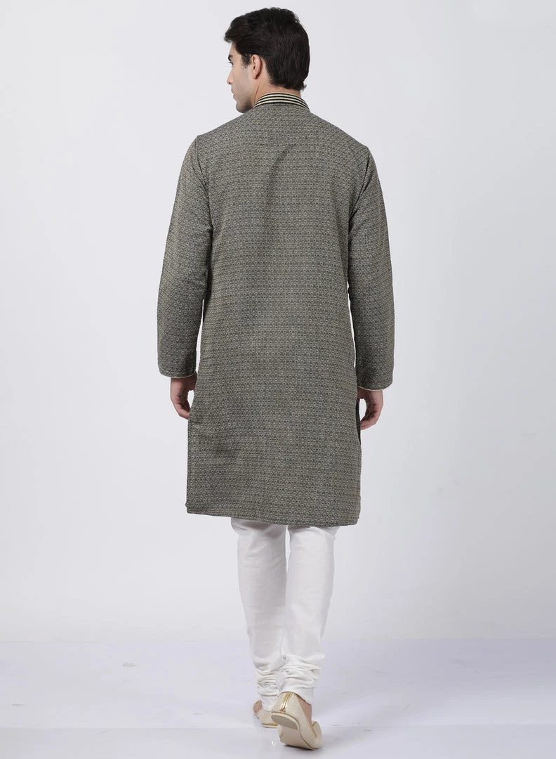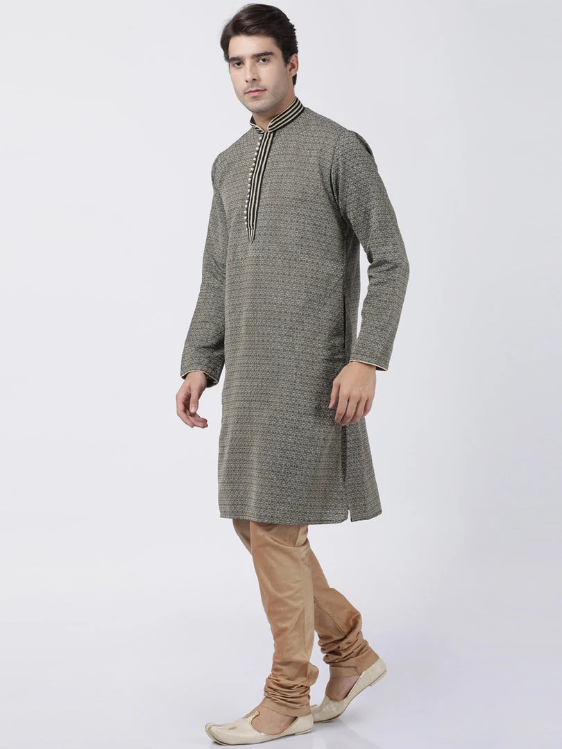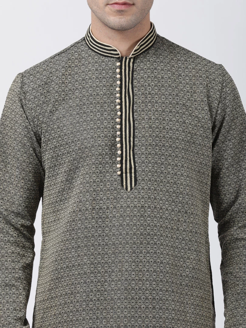 Black and grey woven straight knee length kurta, has a mandarin collar, button placket, long sleeves, straight hem