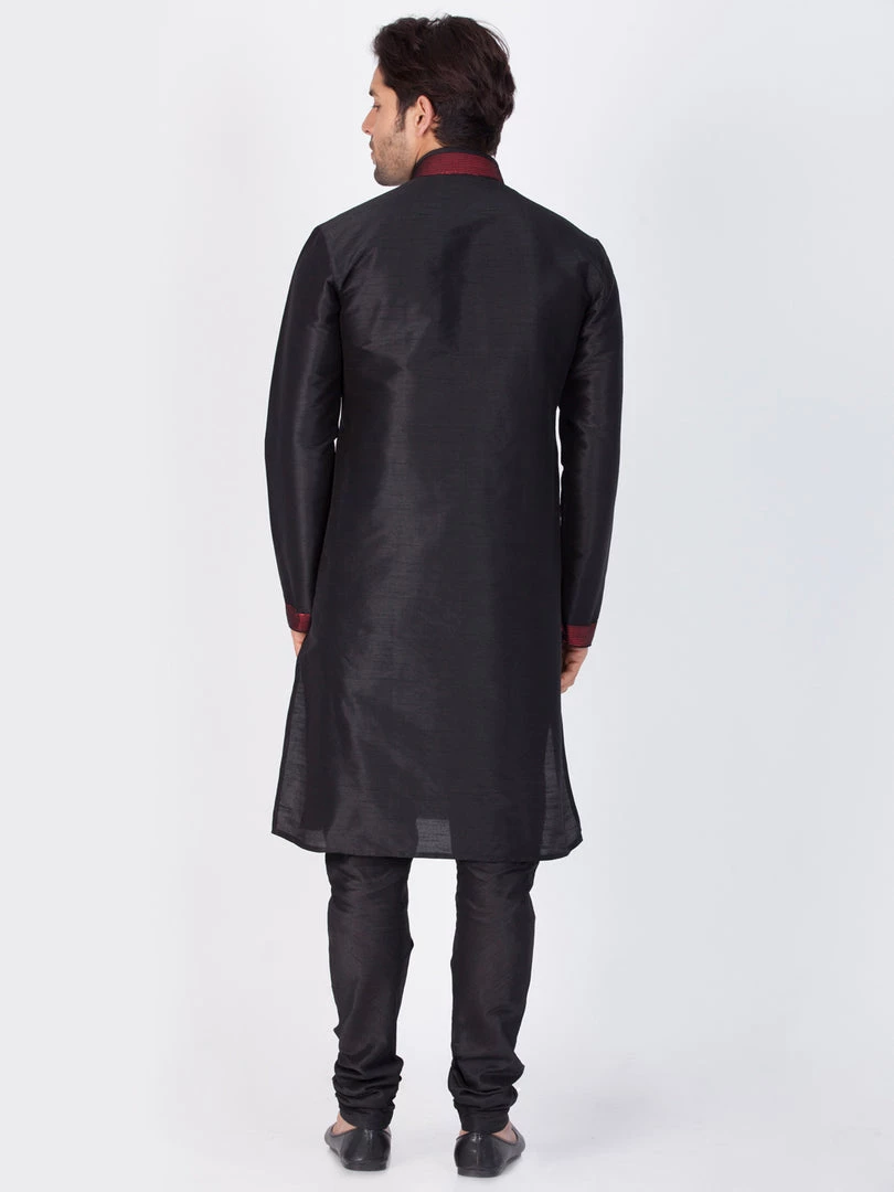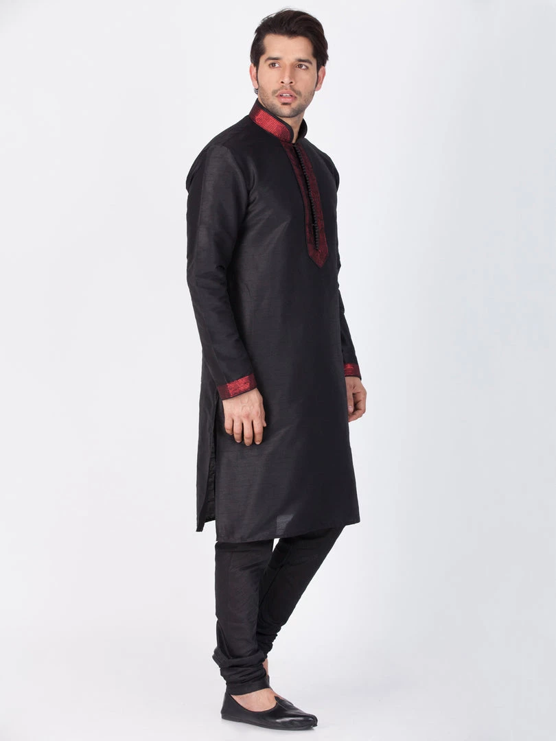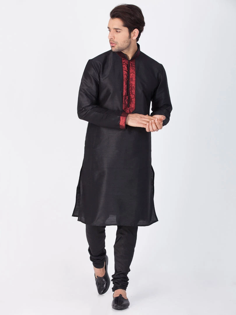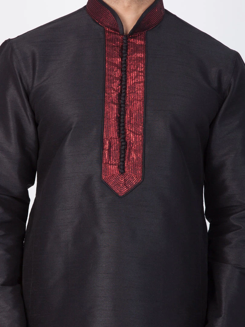 Black solid straight knee length kurta, has a red mandarin collar, long sleeves, red border on sleeves, button placket, straight hem