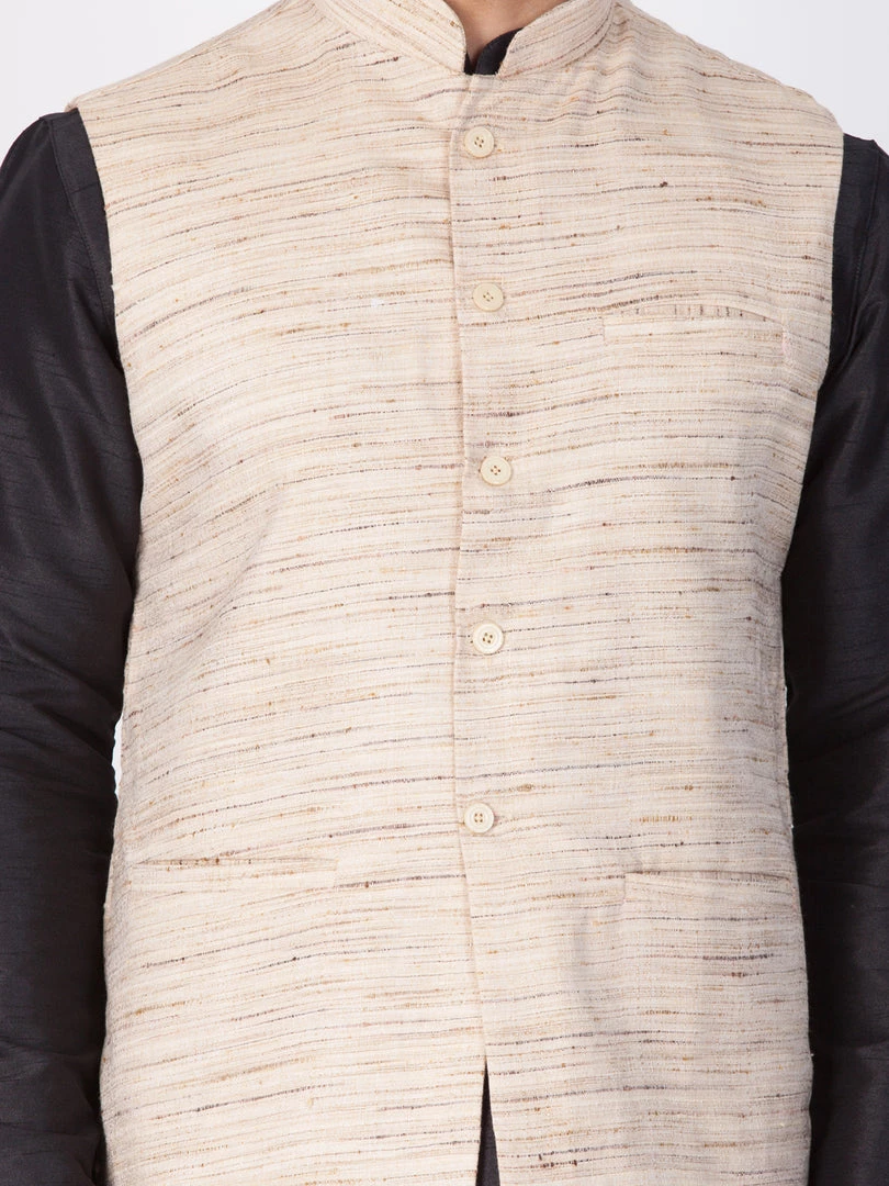 Beige woven Nehru jacket, has a mandarin collar, sleeveless, three pockets