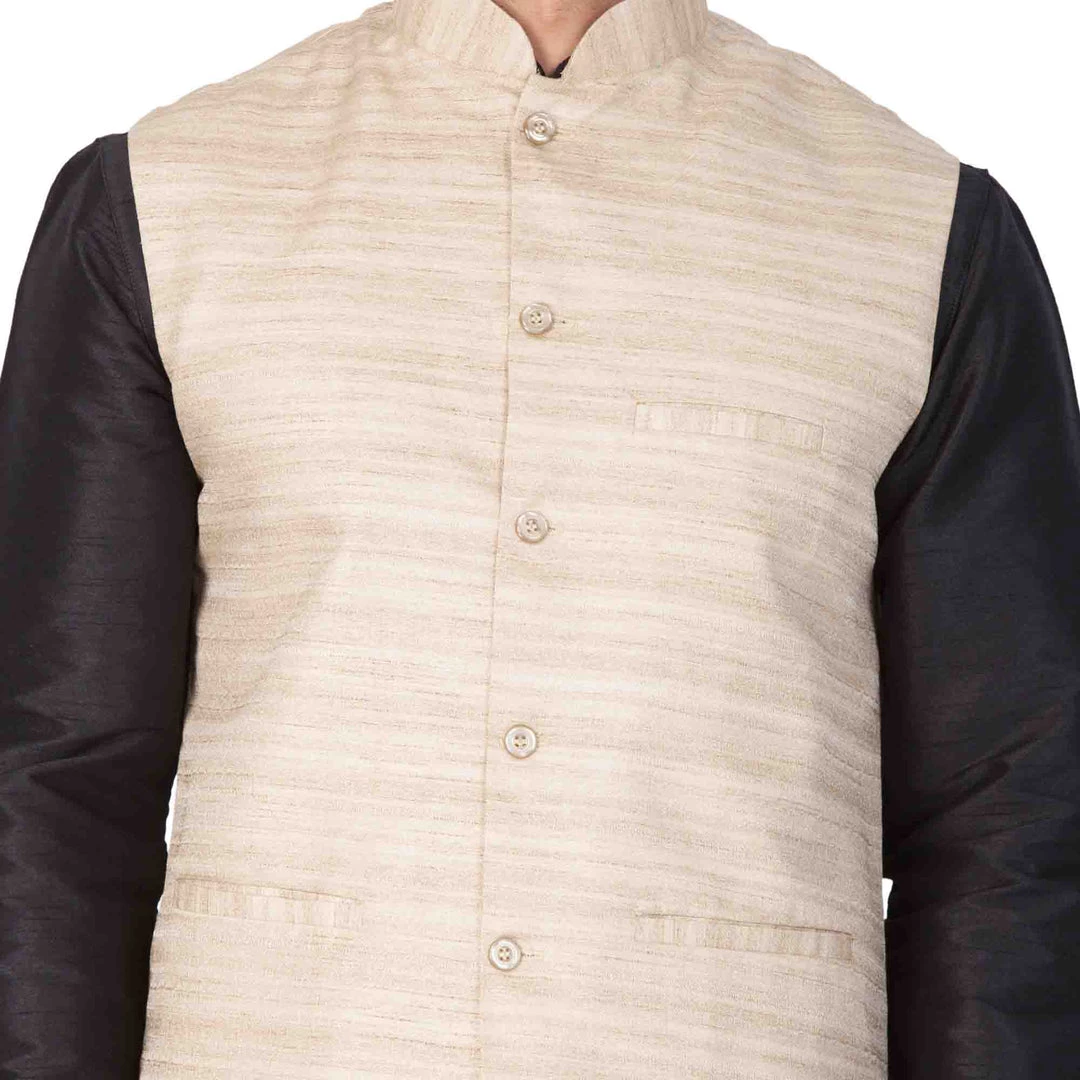 Beige woven-design slim-fit Nehru jacket, has a mandarin collar, sleeveless, a full button placket, three pockets