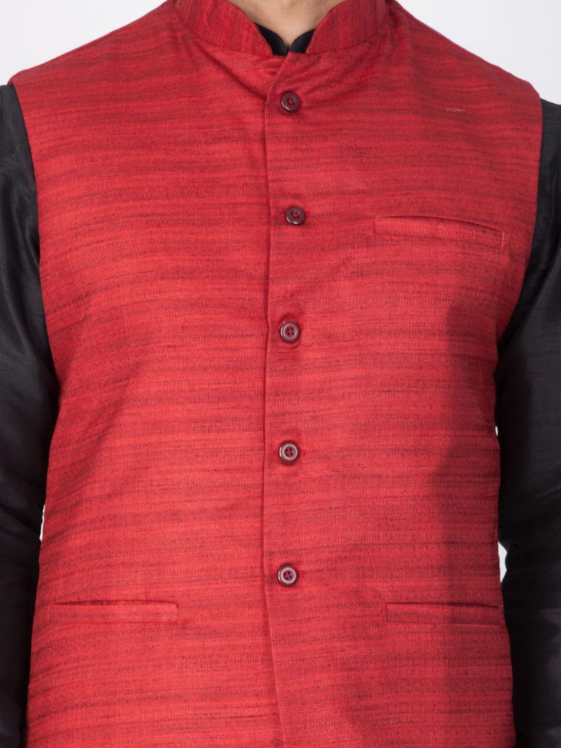Black solid kurta with solid churidar and maroon Nehru jacket