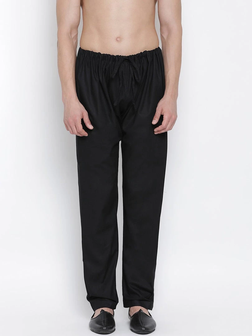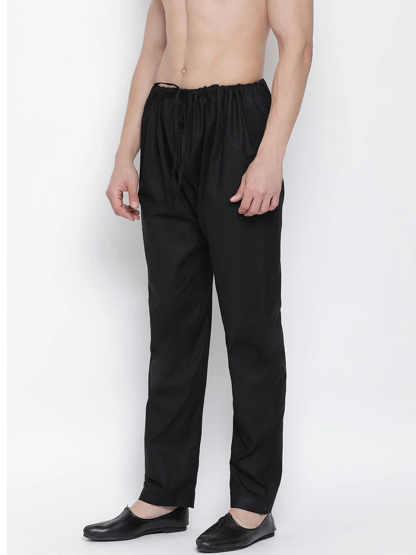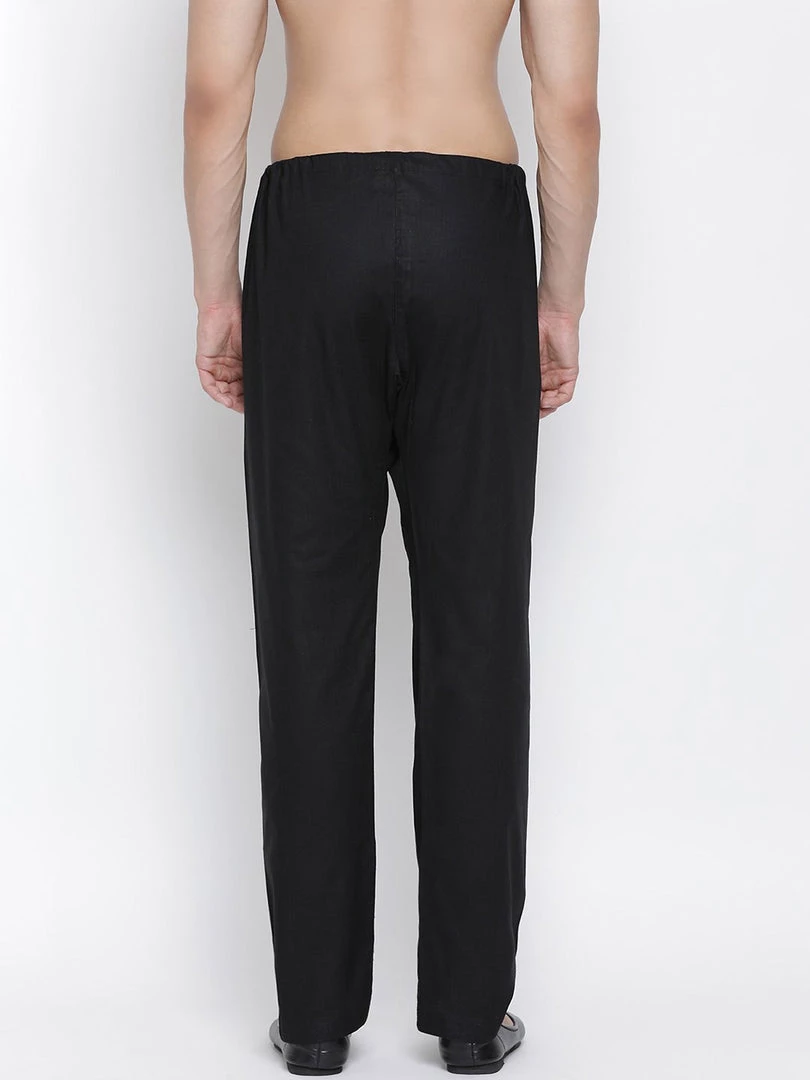 A pair of black color solid pyjama, has drawstring fastening
