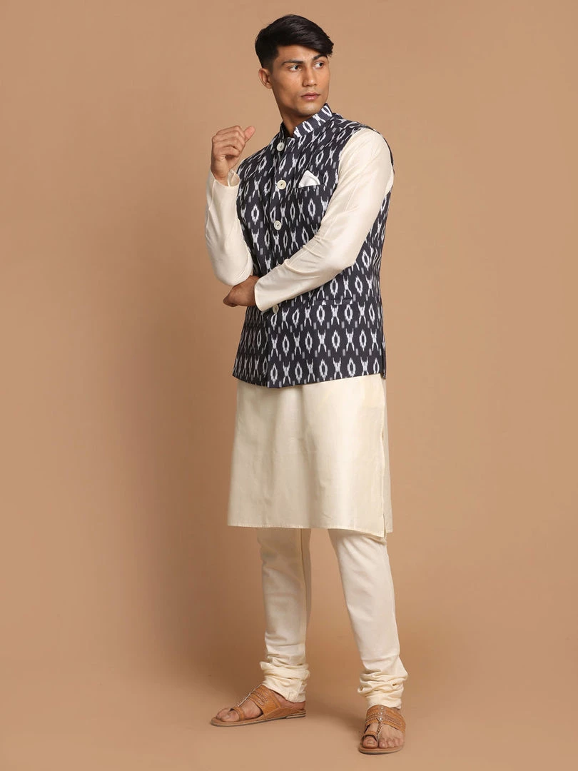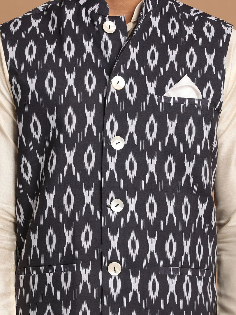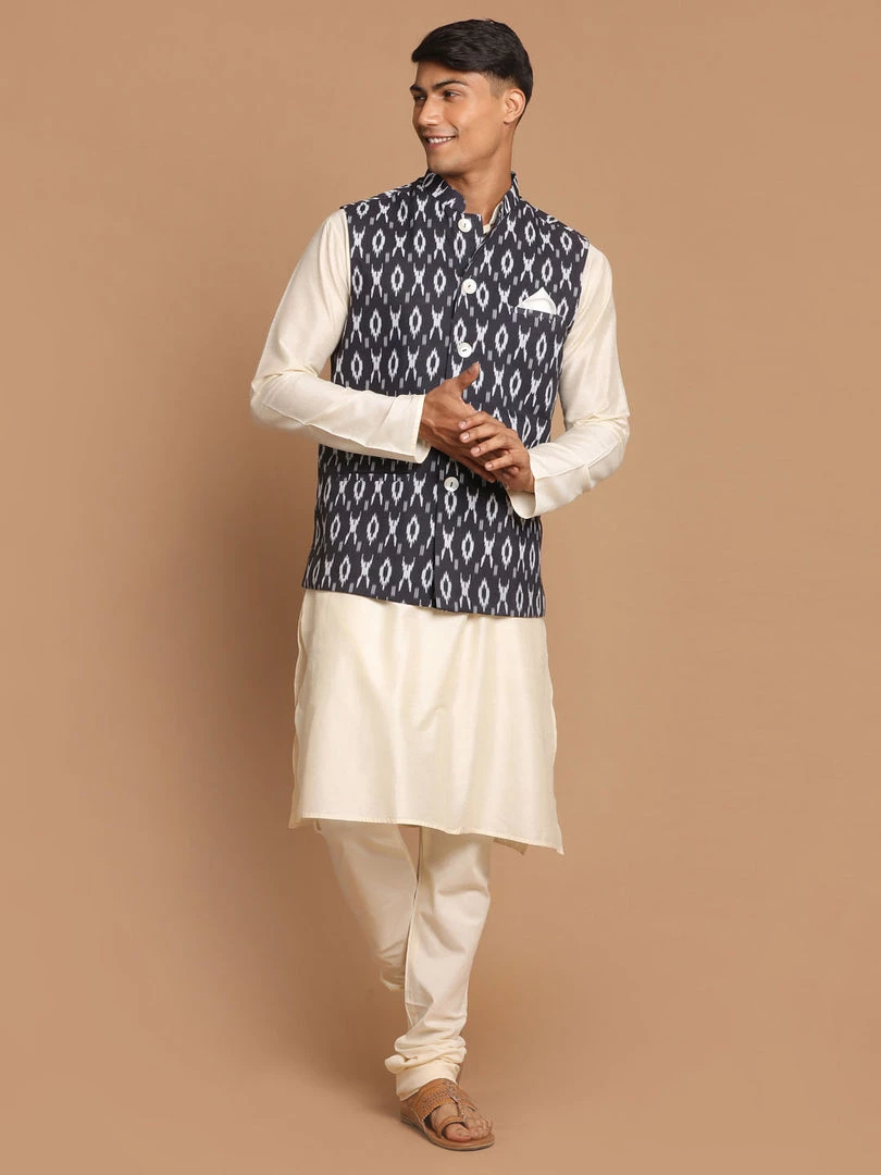 Traditional Ikkat Print Straight Hem Classic Nehru jacket with Cream Viscose Rayon Kurta Pyjama Set.