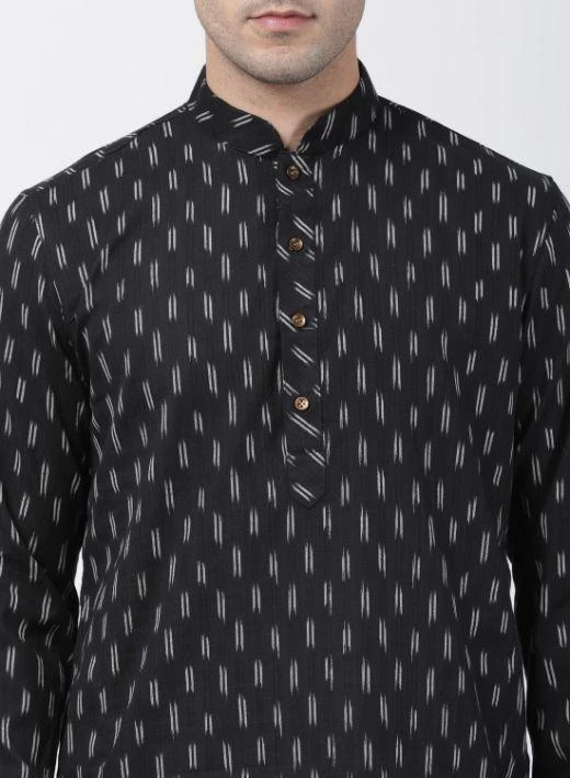 Black and white woven straight knee-length kurta, has a mandarin collar, button placket, long sleeves, straight hem