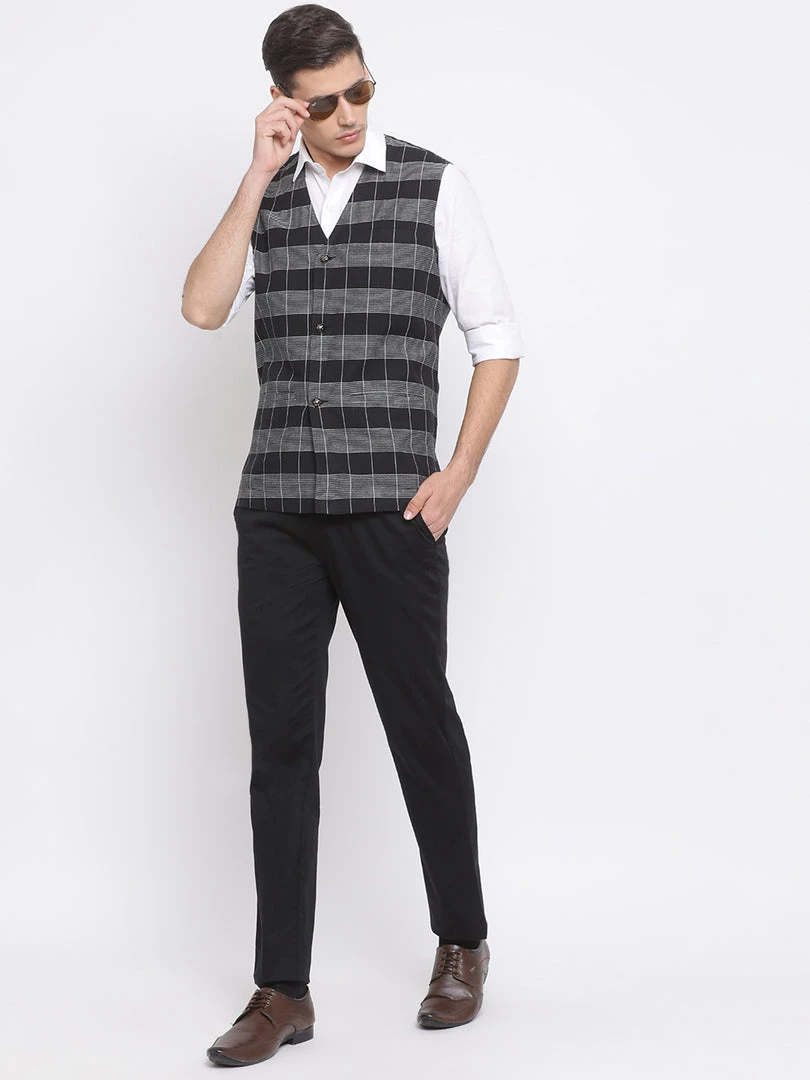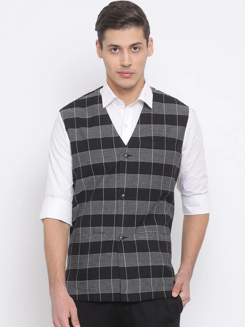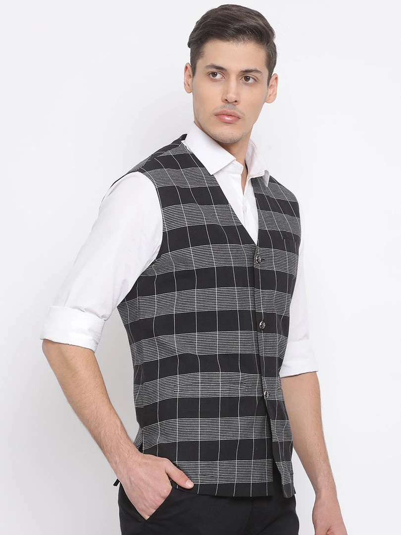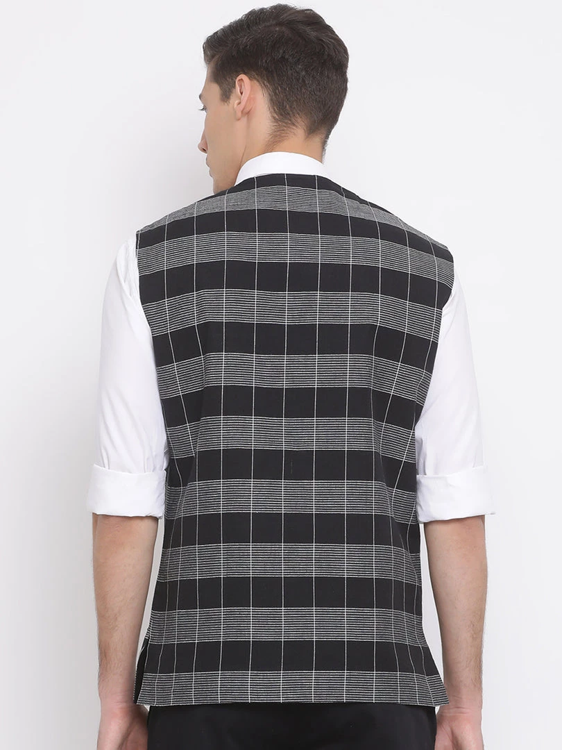 Black and grey checked regular-fit Nehru jacket, has a V neck, sleeveless, a full button placket and straight hem