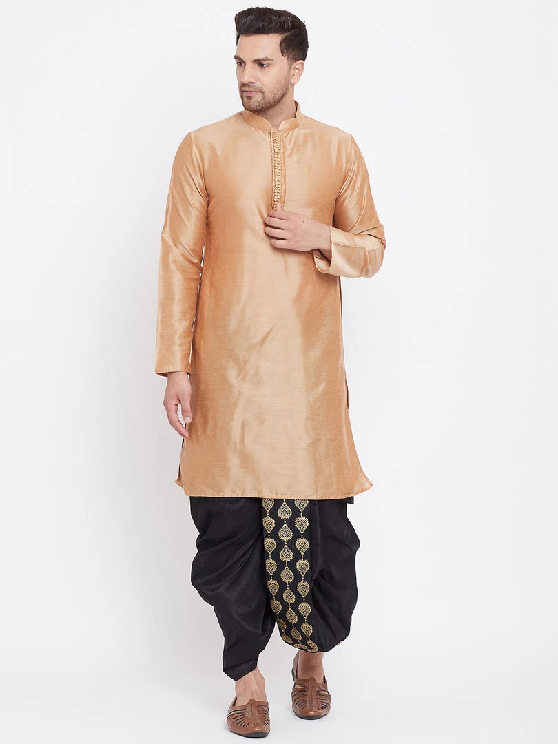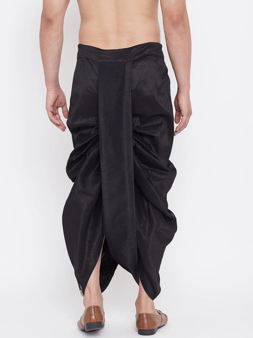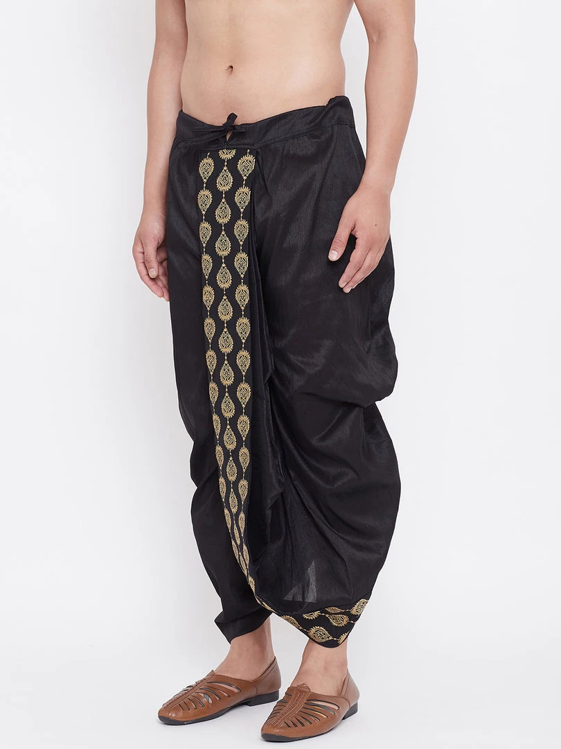Black solid mid-rise ready to wear dhoti in a traditional pattern and golden embroidered detailing, has a waistband with drawstring closure.Â