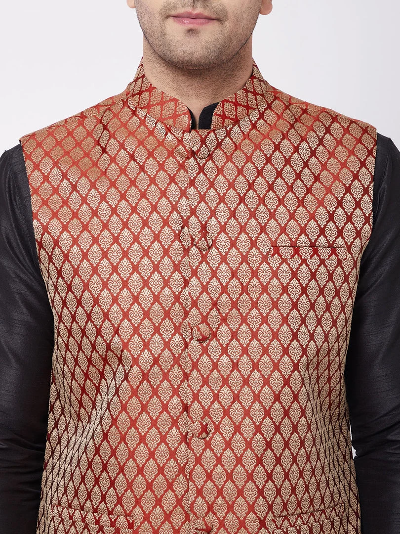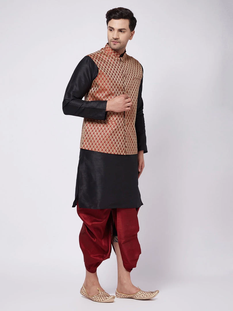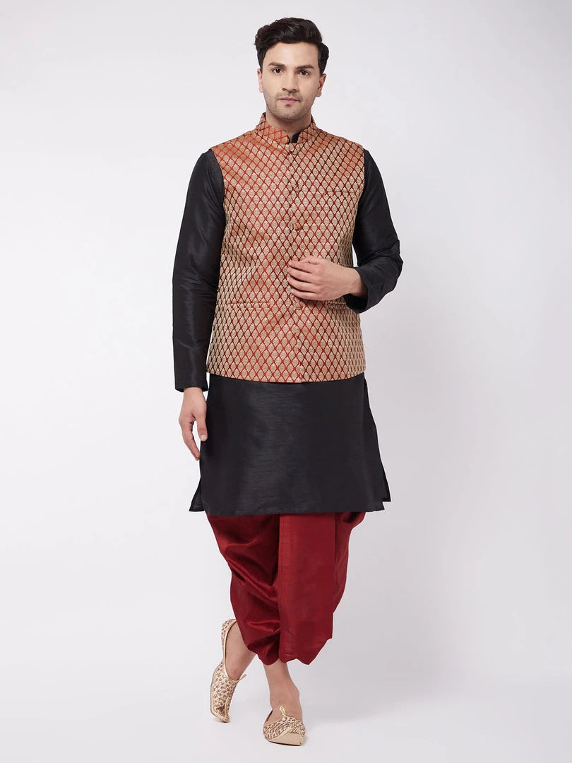 Black Solid Kurta With Maroon Solid Dhoti And Maroon Colored Woven Nehru jacket