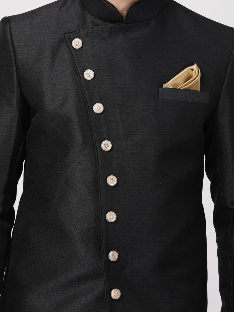 Black Solid Sherwani, Angrakha style, straight Hip-length Sherwani, has a Mandarin collar, Full Sleeve, Straight hem, and one pocket with a pocket square.
