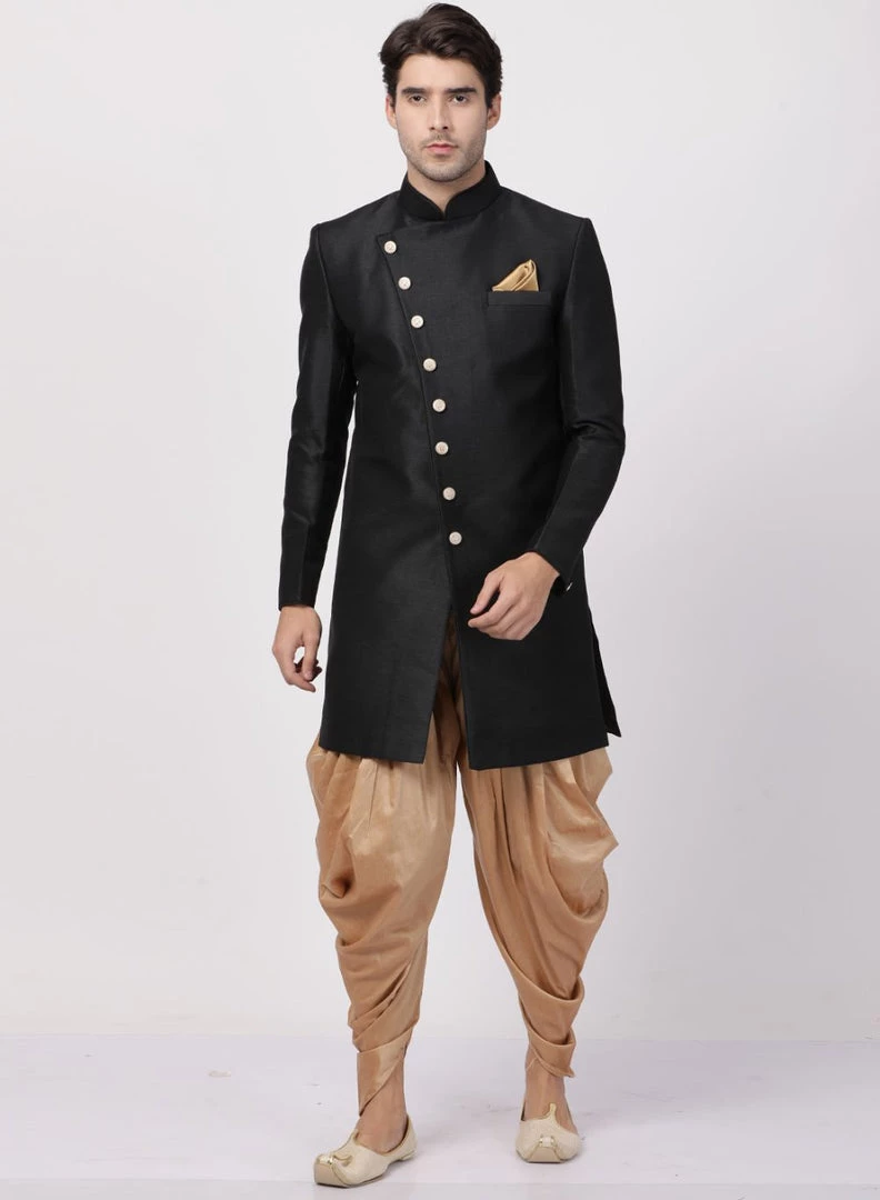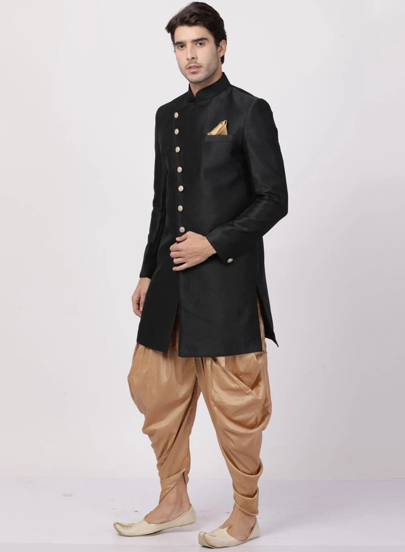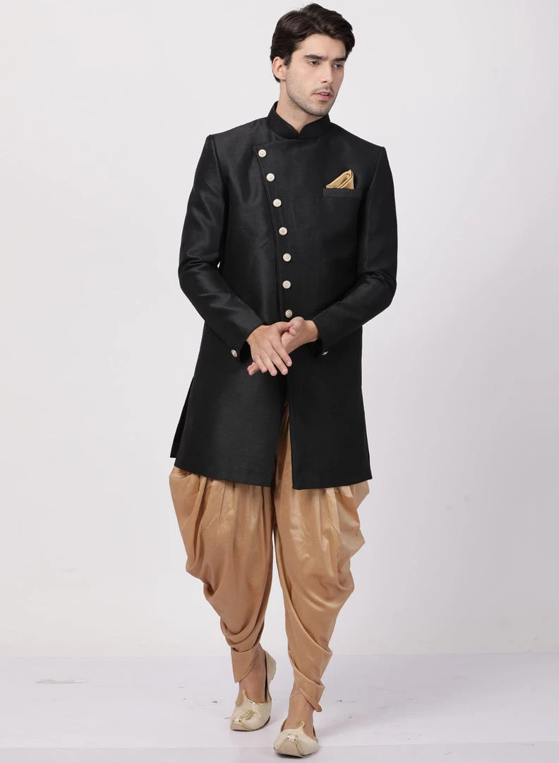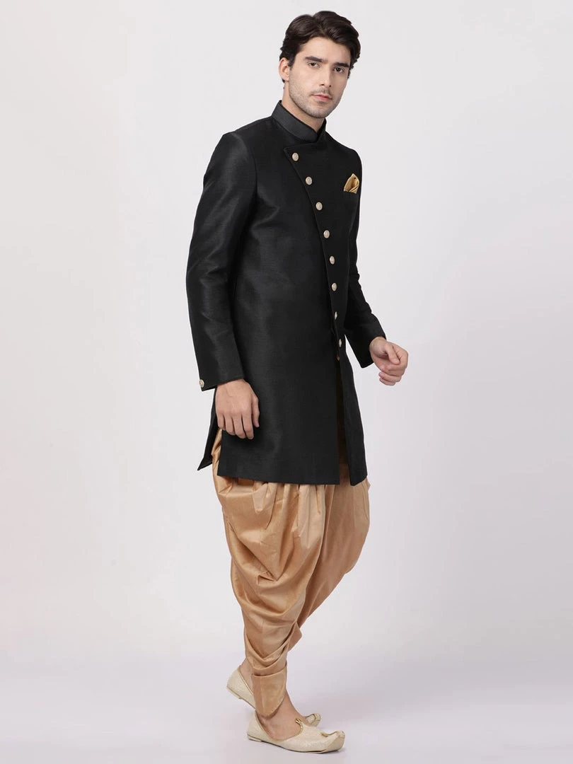 Black solid sherwani with gold-toned solid dhoti pant