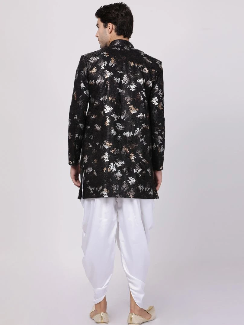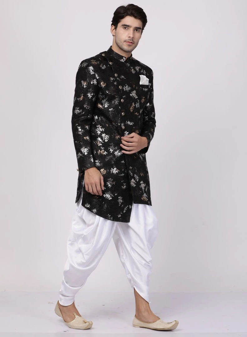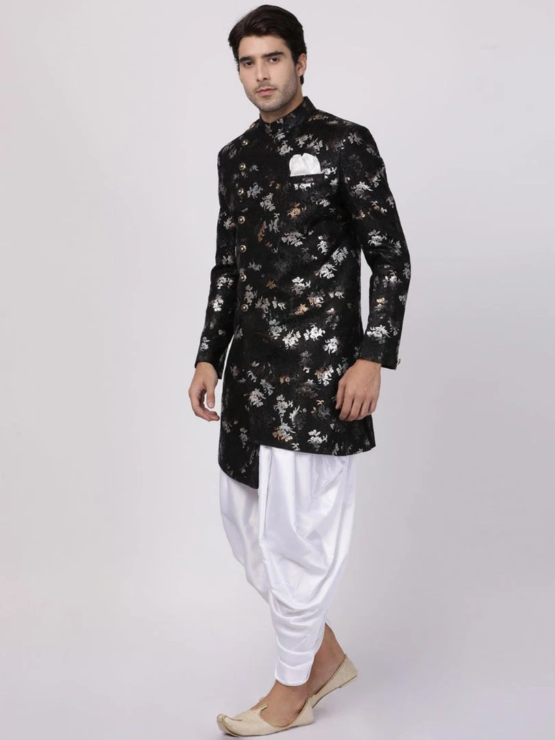 Black floral printed sherwani, has a mandarin collar, a side button placket, long sleeves, a welt pocket, asymmetric hem, side slits. Comes with pocket square.