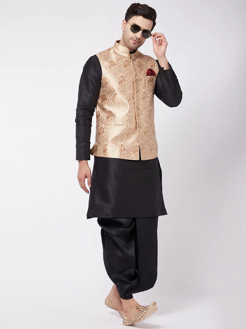 Black Silk Blend Kurta With Dhoti and Rose Gold Woven Nehru jacket