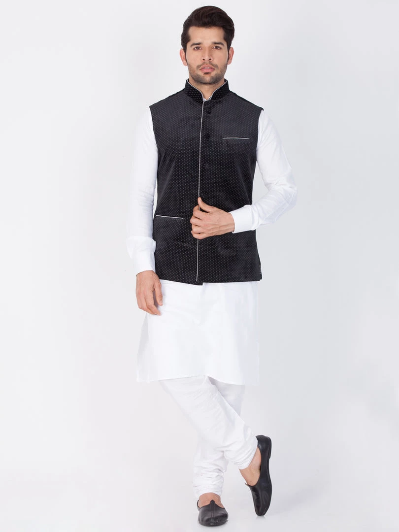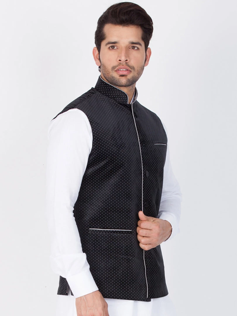 Black polka dot velvet Nehru jacket, has a mandarin collar, sleeveless, a full button placket, three pockets