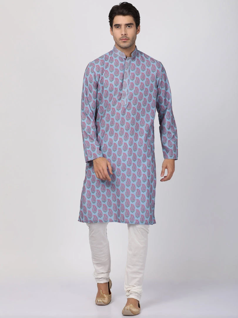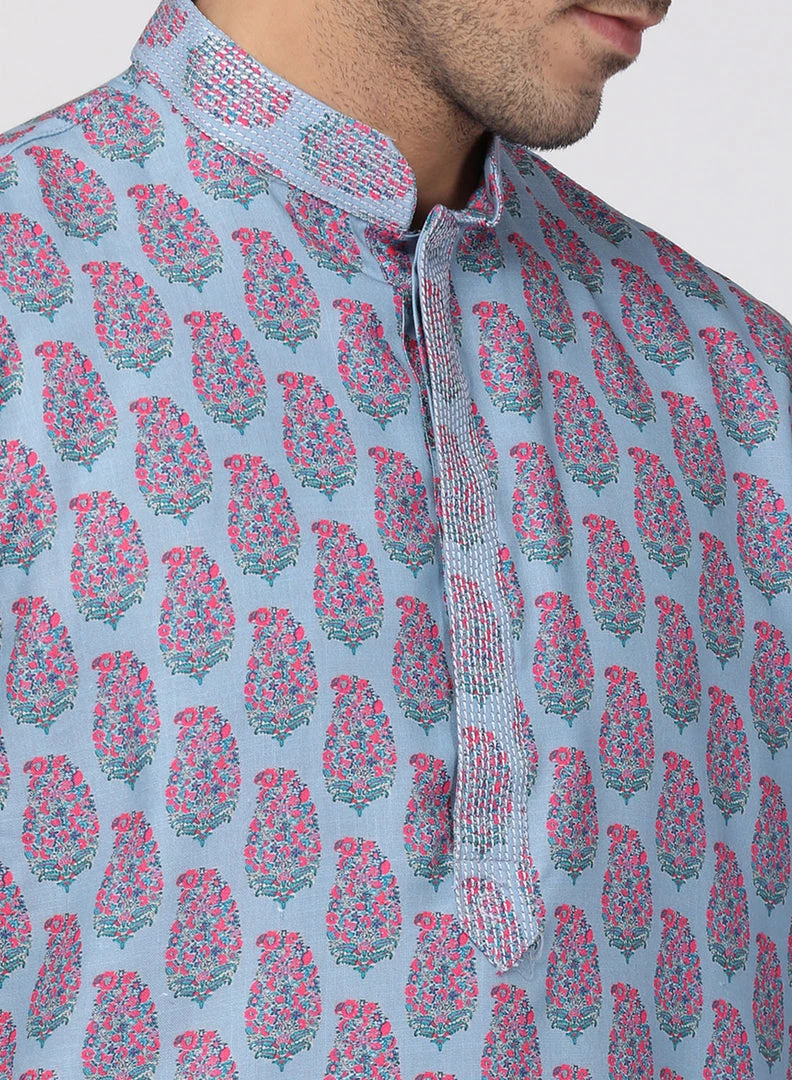 Blue and Pink Digitally Printed straight Knee length kurta, has a Mandarin Collar, button placket, long sleeves, Straight hem, Side slits.
