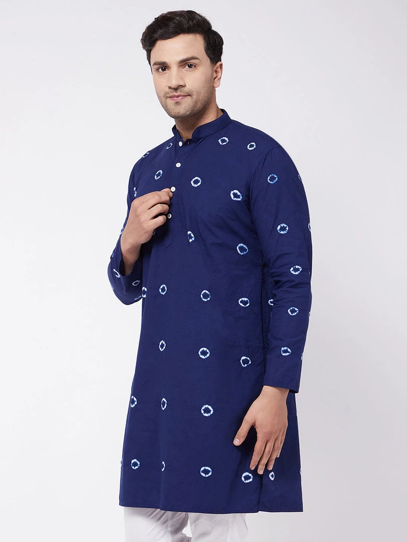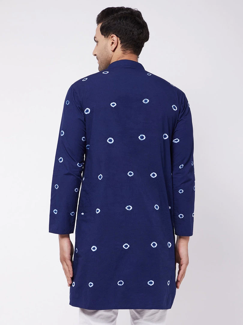 Blue and white tie-dye straight cotton knee-length kurta, has a mandarin collar, button placket, long sleeves, a straight hem, and side slits.