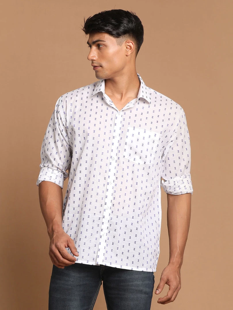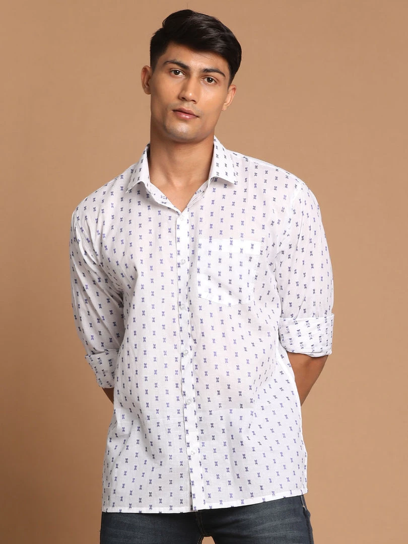 Blue and white woven design casual shirt, has a shirt collar, long sleeves, straight hem, one patch pocket, full button placket.