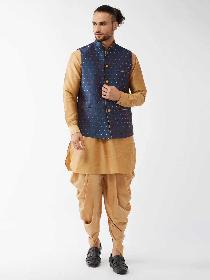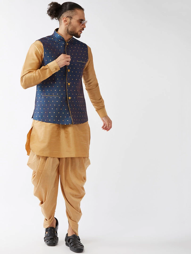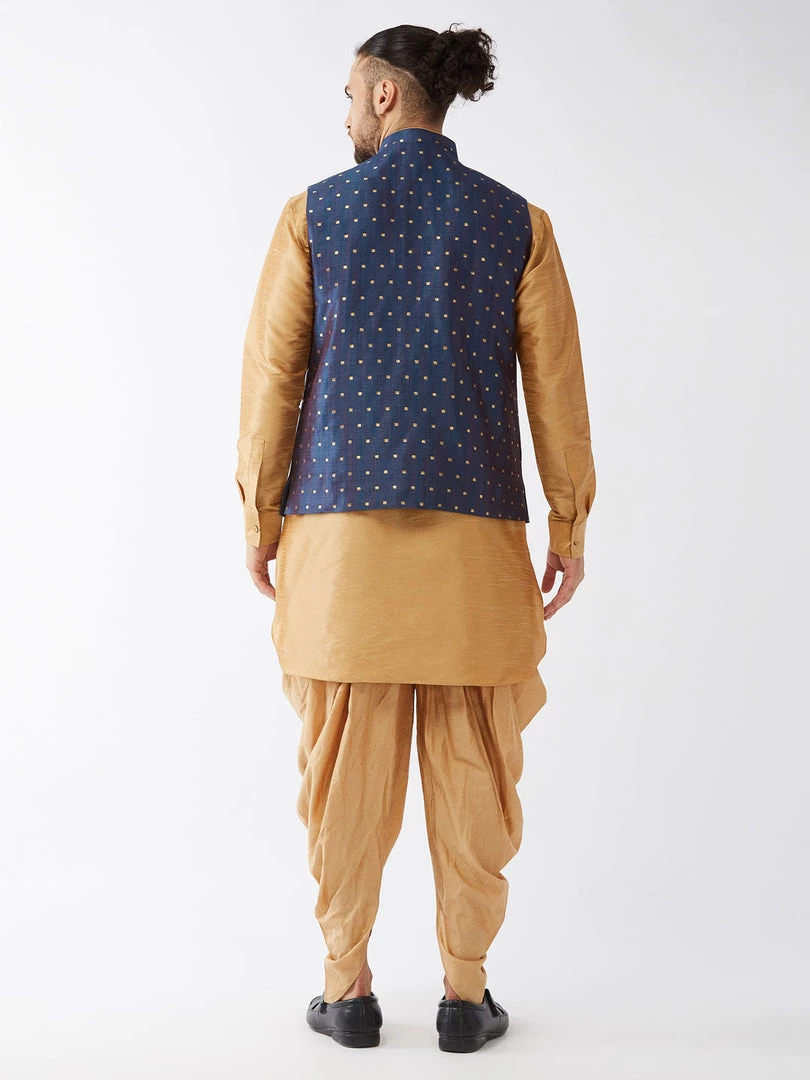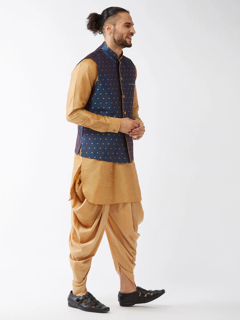 Rose Gold Solid kurta with dhoti pants and Blue colored woven Design Nehru jacket