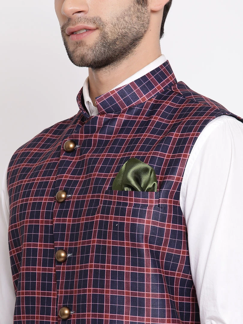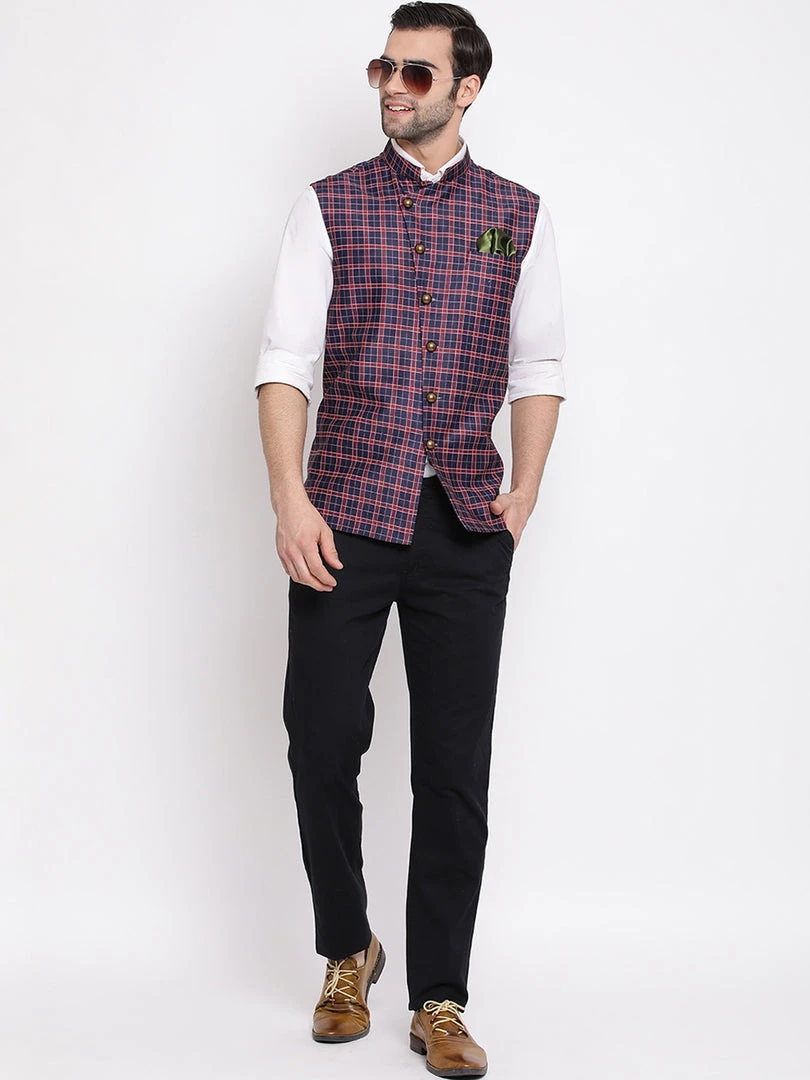 Blue and red woven checked angrakha Nehru jacket, has a mandarin collar, a full button placket, sleeveless, a welt pocket