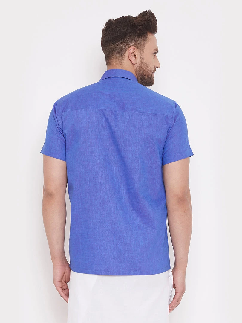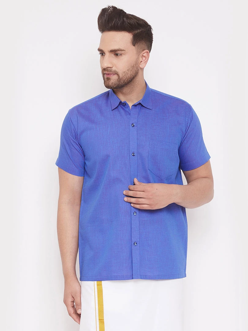 Blue solid casual shirt, has a shirt collar, half sleeves, straight hem, one patch pocket