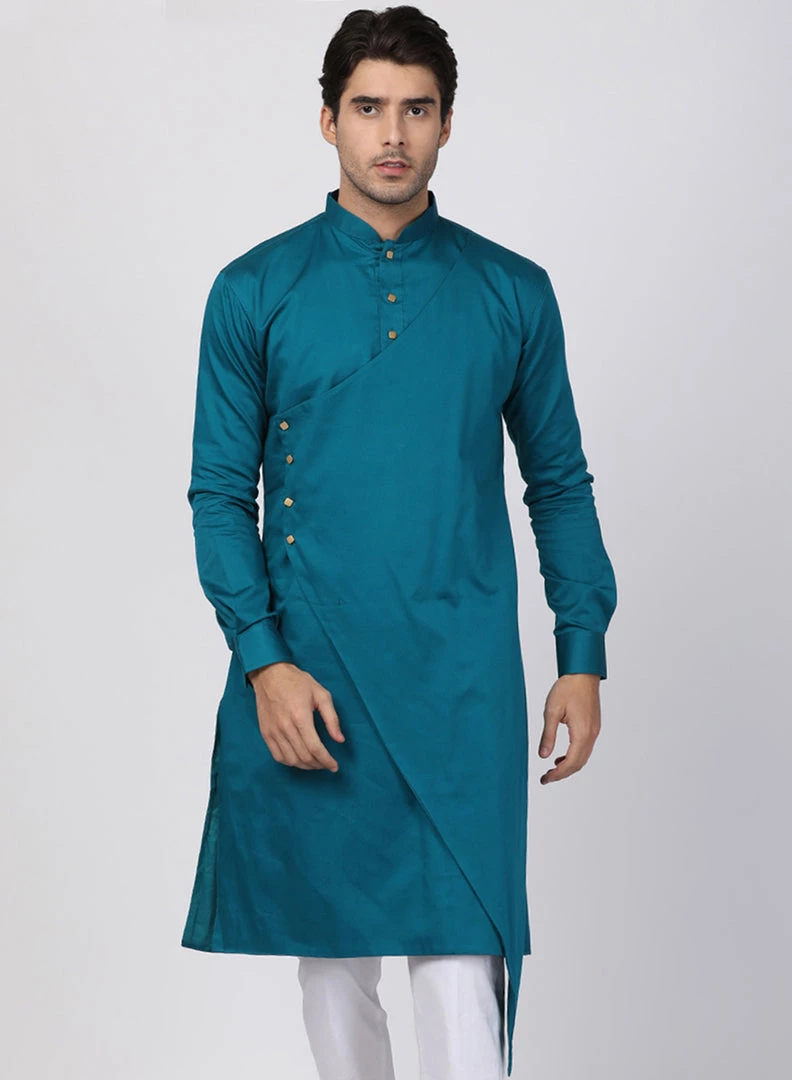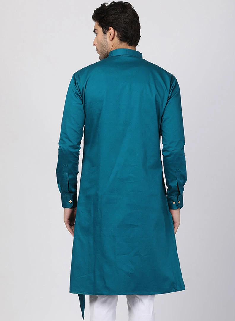 Blue solid layered straight cuff length kurta, has a mandarin collar, button placket, long sleeves, asymmetric hem.