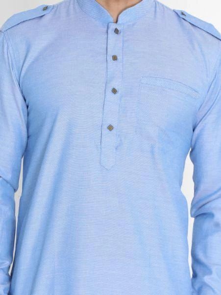 Blue solid straight above knee length kurta, has a mandarin collar, button placket, long sleeves, curved hem