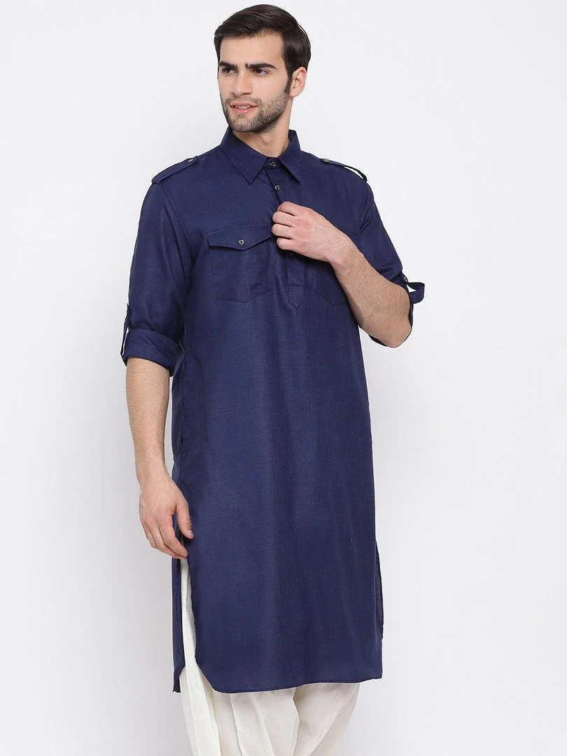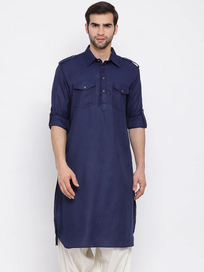 Blue straight knee length pathani kurta, has a shirt collar, long sleeves, button placket, curved hem, two pockets and side slits