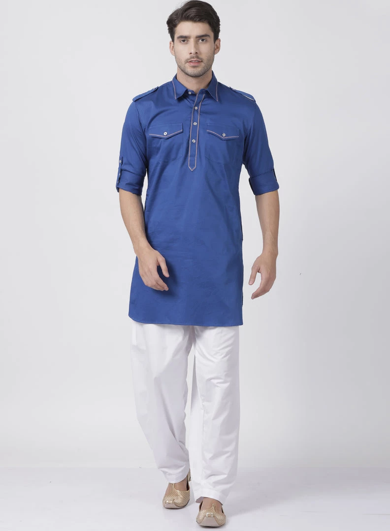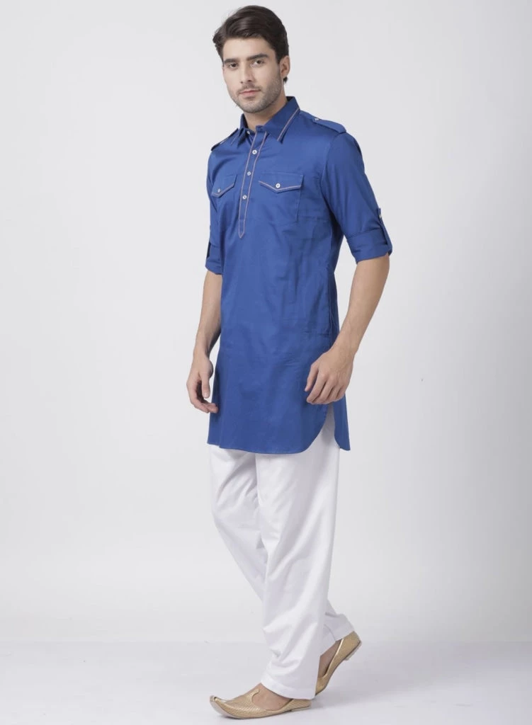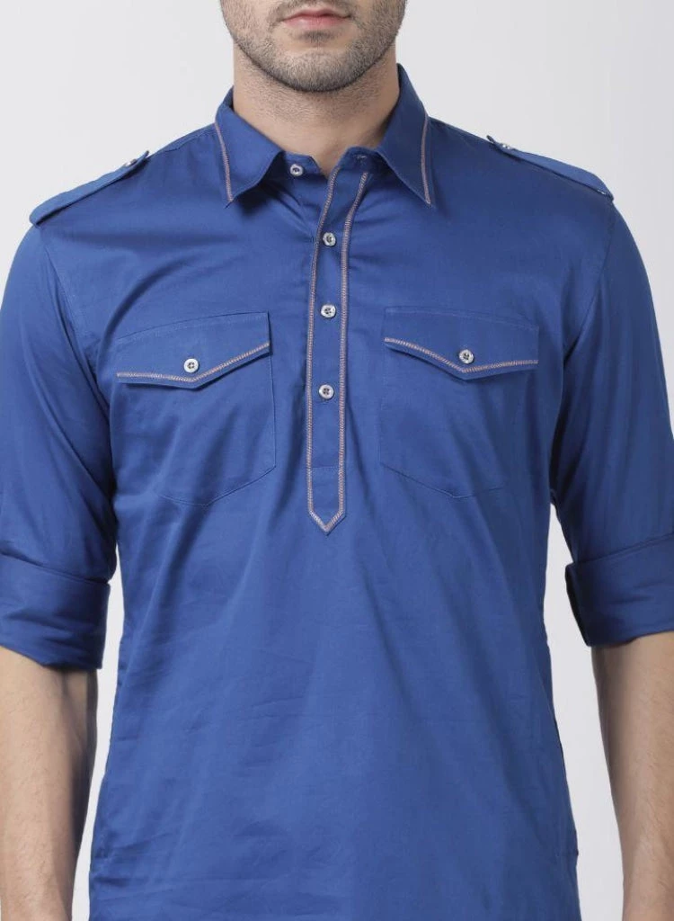 Blue solid pathani kurta, has a shirt collar, long roll up sleeves, shoulder tabs, button placket, curved hem, two patch pockets and side slits