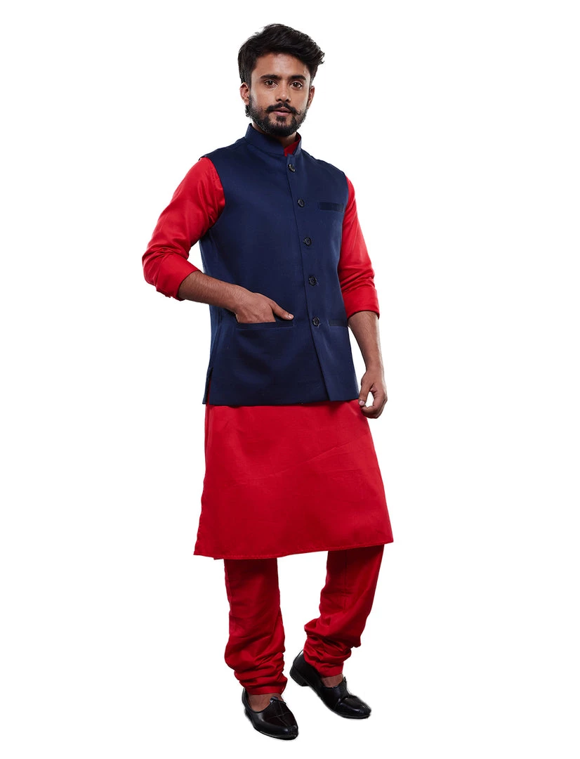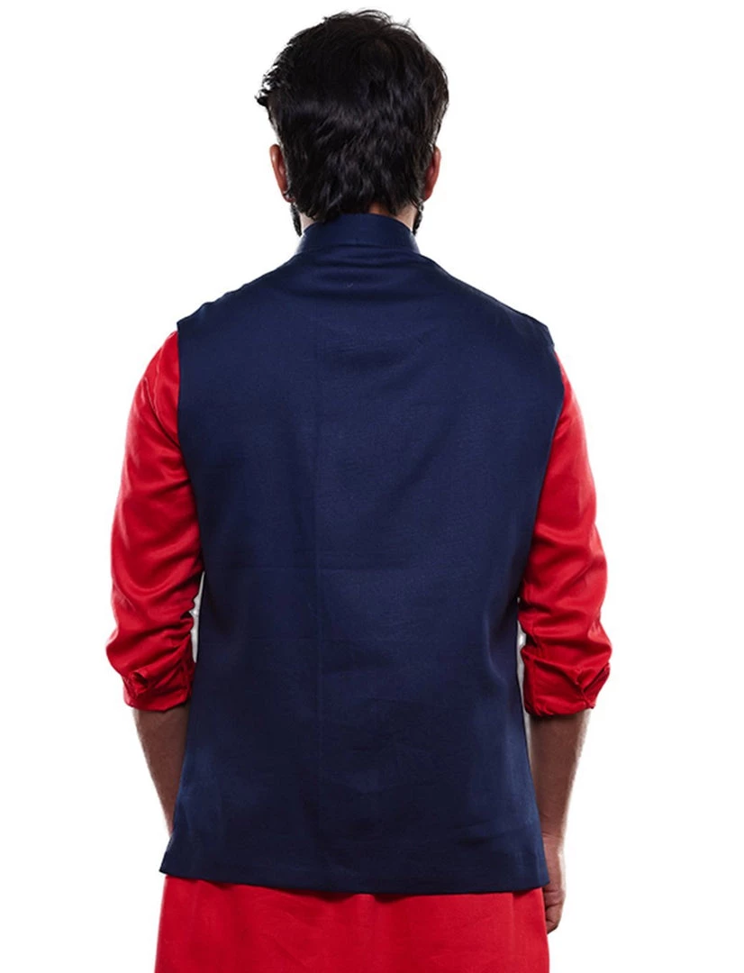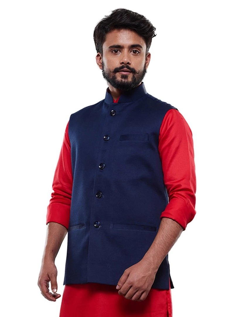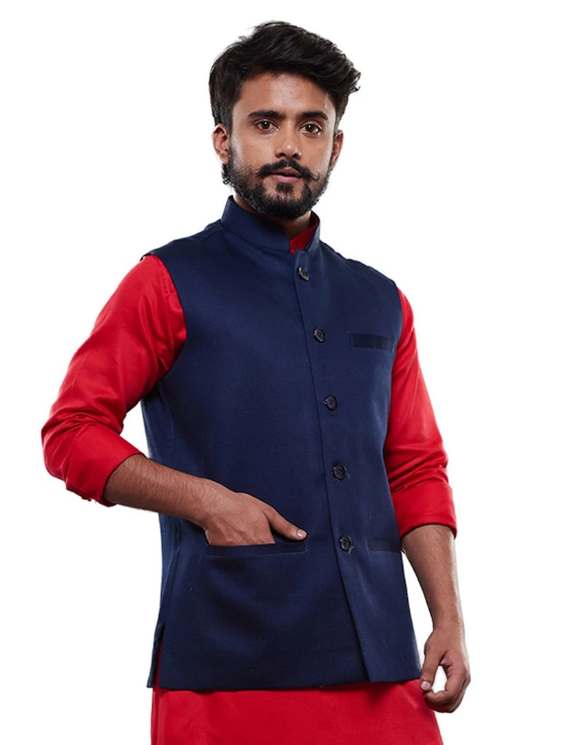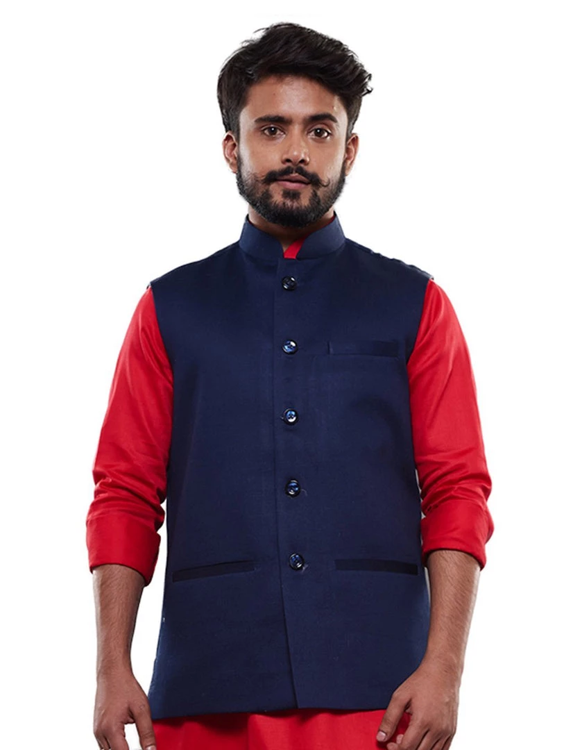 Navy Blue Solid Waist Coat, Regular style, Waist-length, has a Mandarin Collar, Sleeveless, Straight hem, and has three pockets
