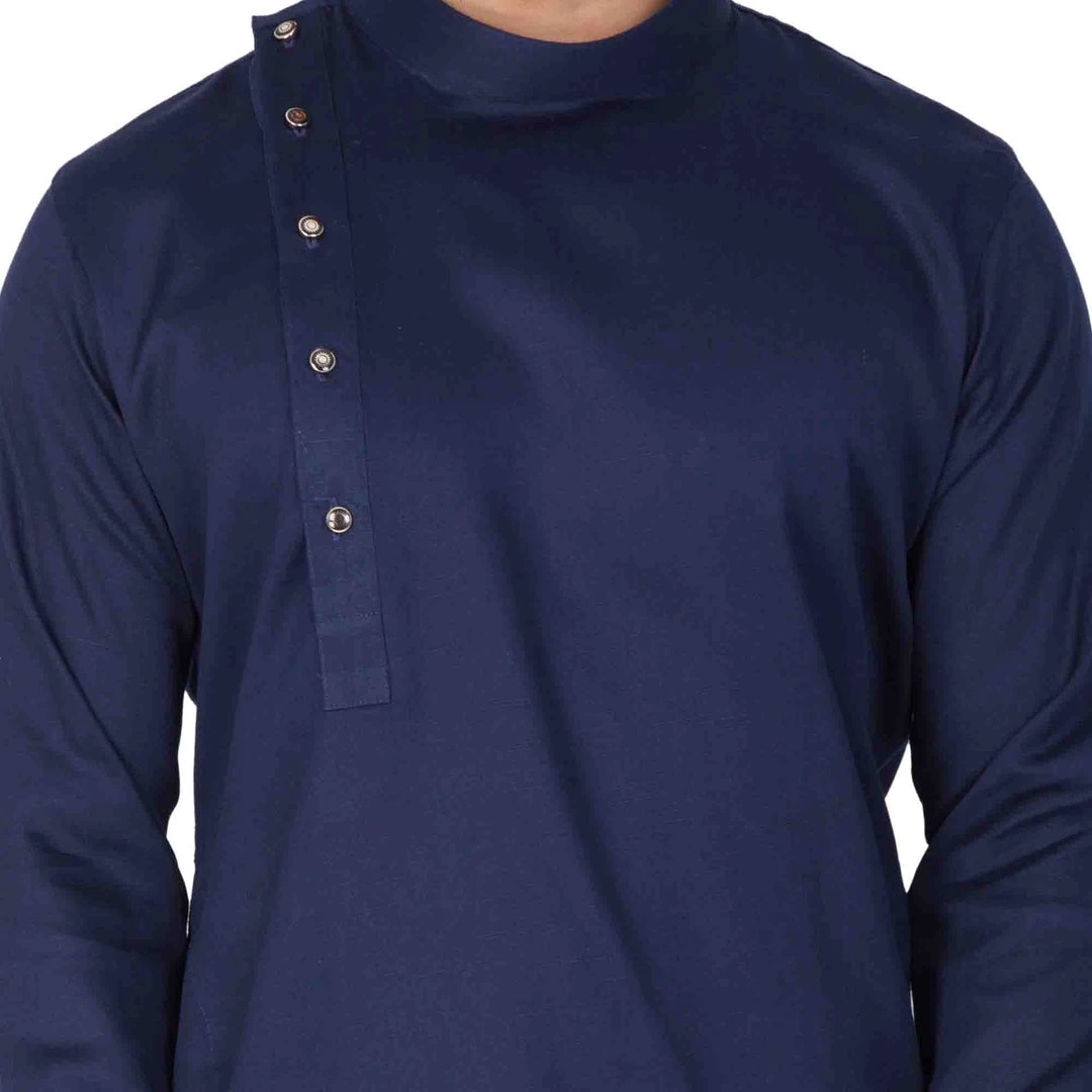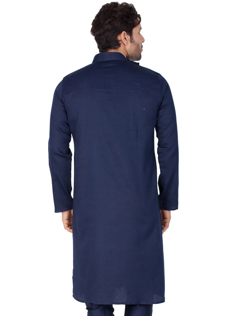 Blue solid straight knee length kurta, has a band collar, side button placket, long sleeves, straight hem