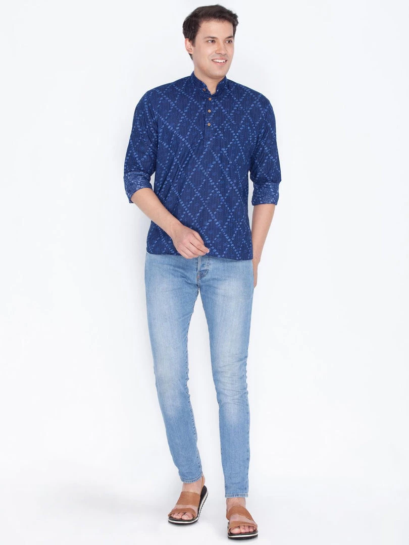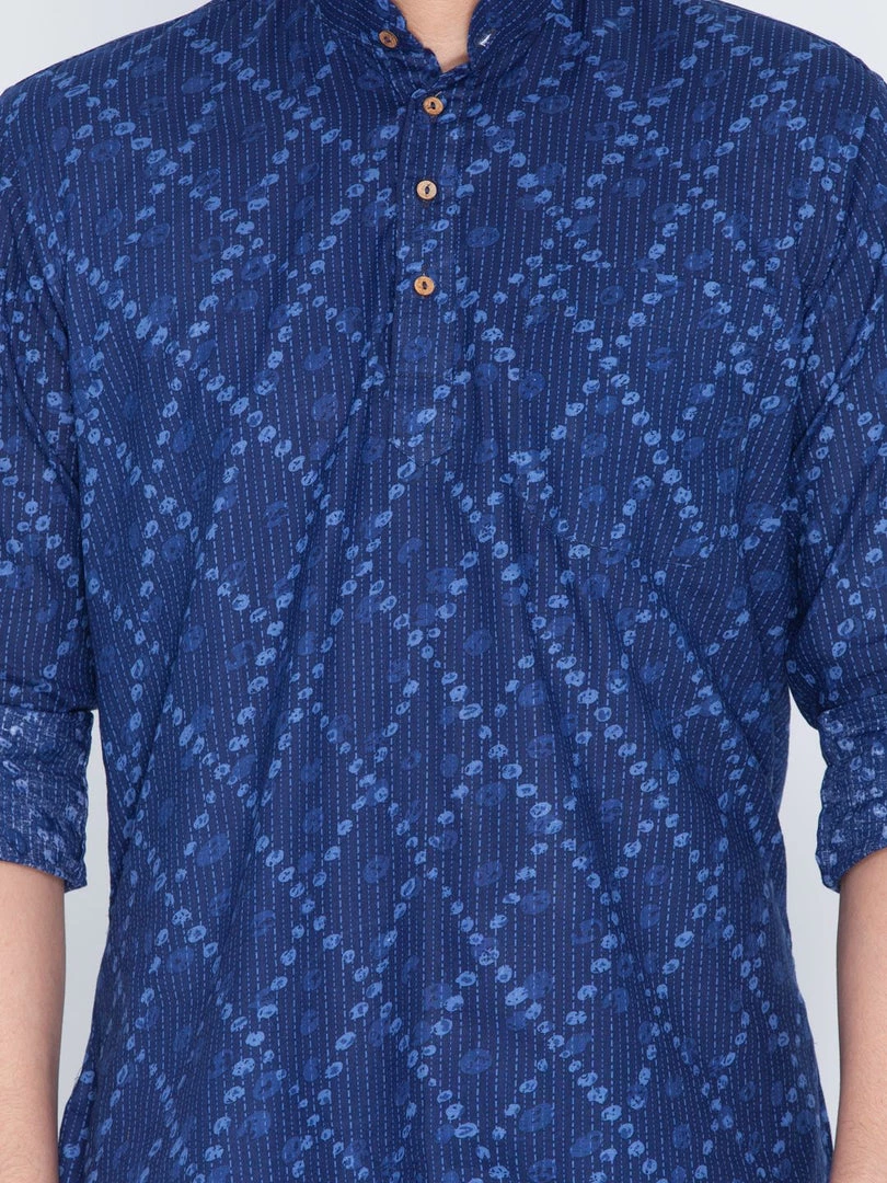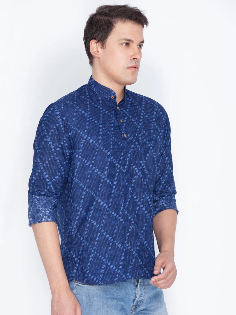 Blue printed kurta, has a mandarin collar, long sleeves, straight hem, button placket