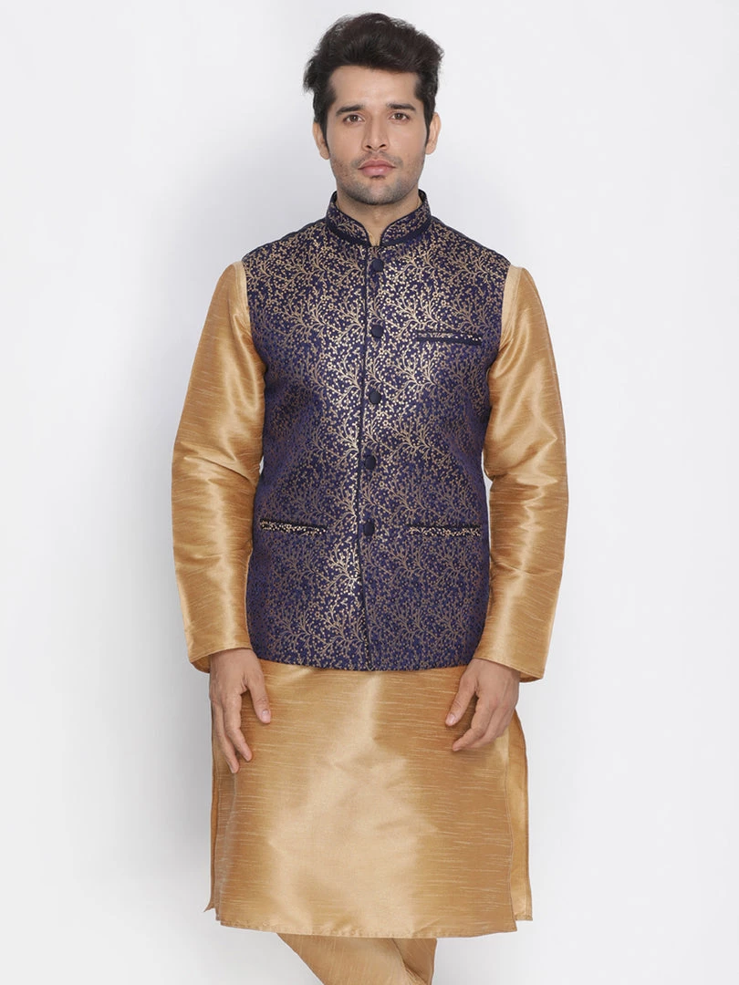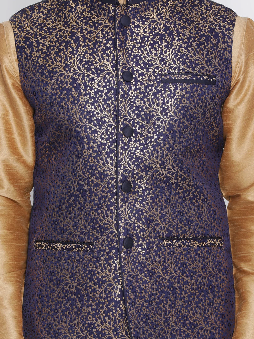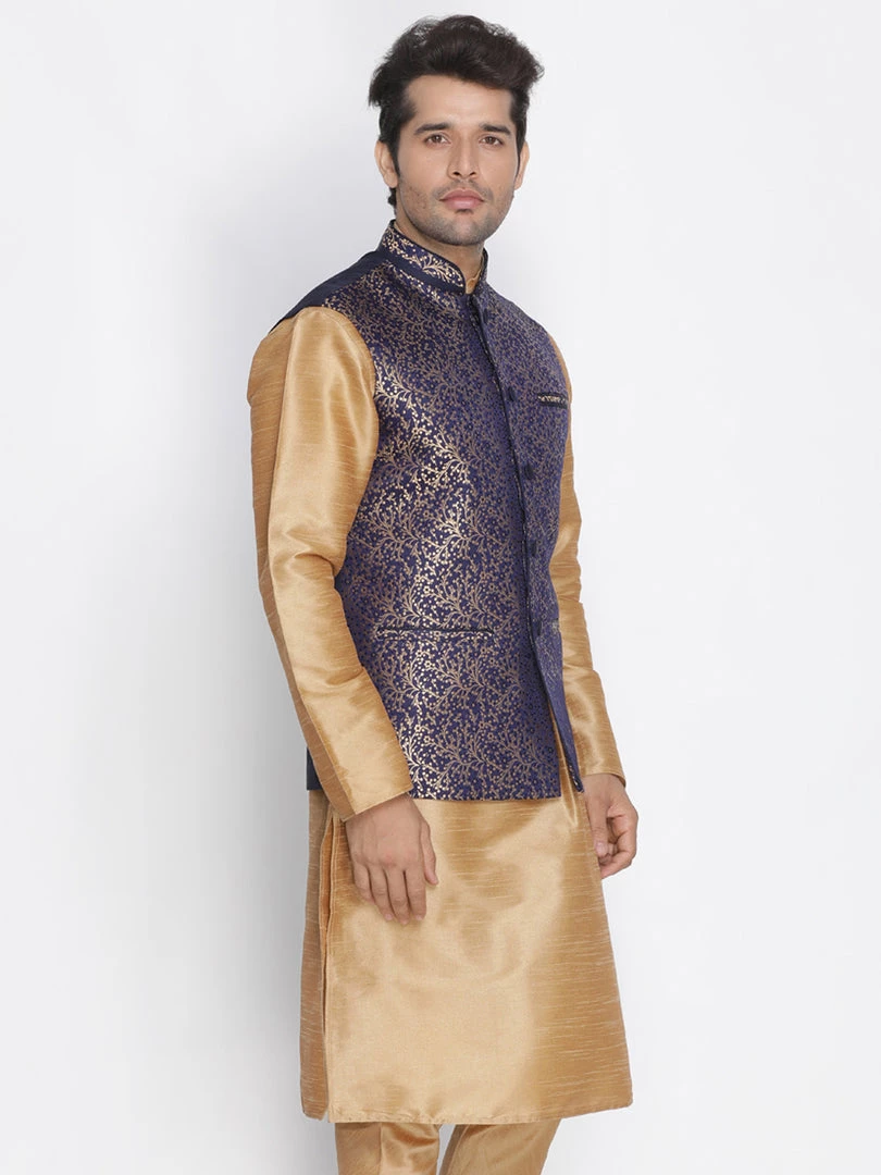 Blue and gold tone printed Nehru jacket, has mandarin collar, a full button placket, sleeveless, three pockets