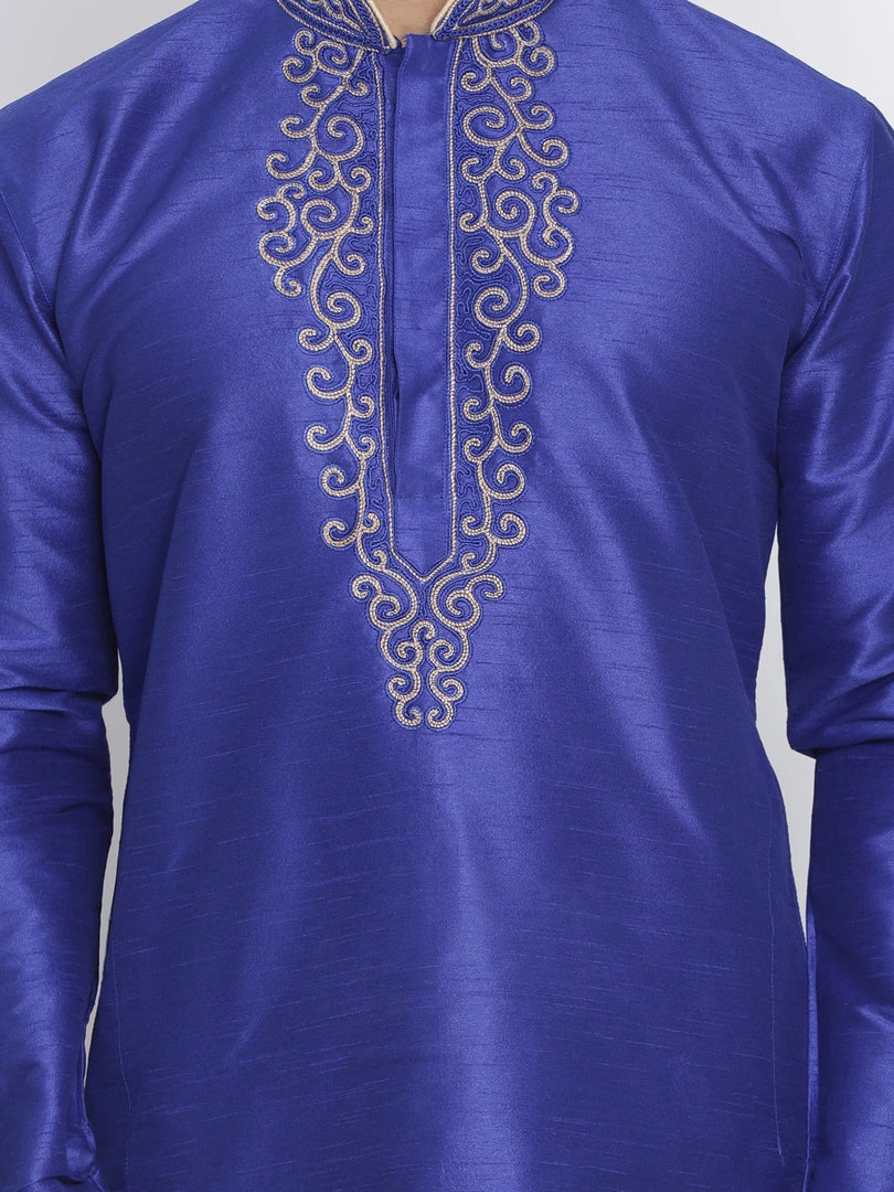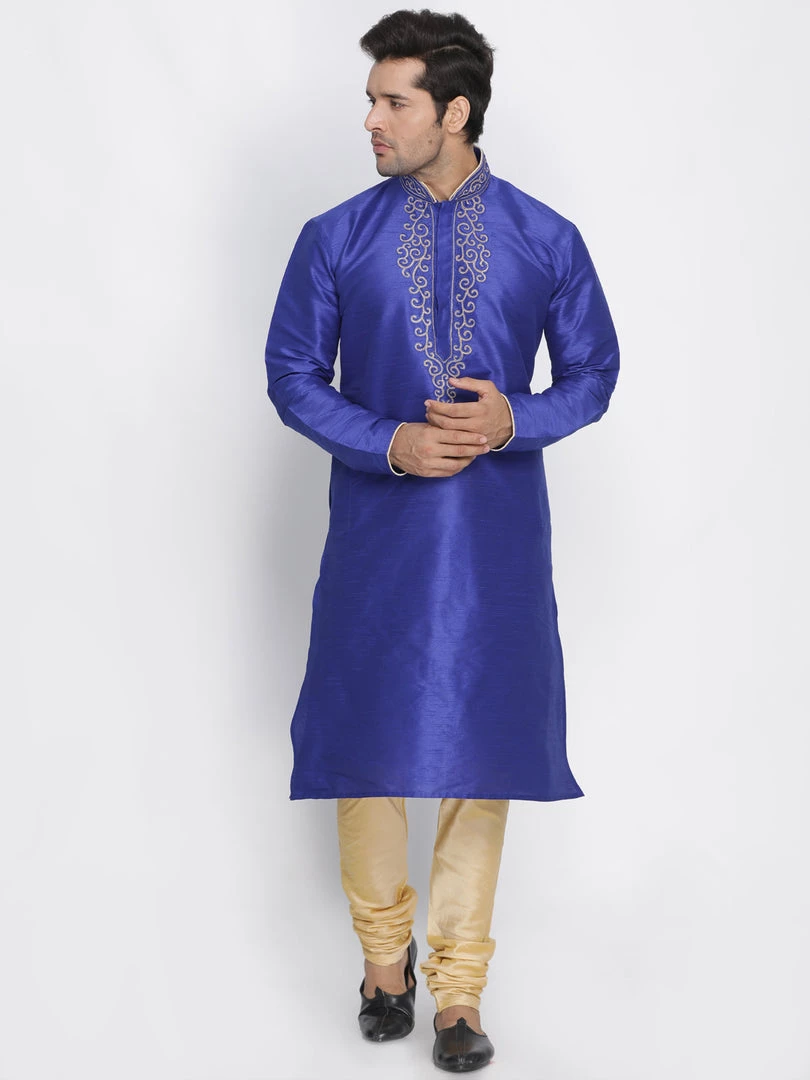 Blue solid straight kurta, has a mandarin collar, long sleeves, straight hem, golden detailing around collar and placket and side slits