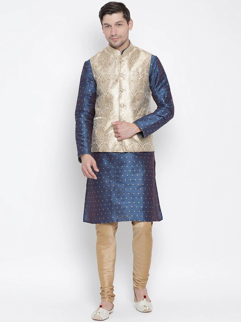 Blue and beige woven kurta with solid churidar and beige Nehru jacket