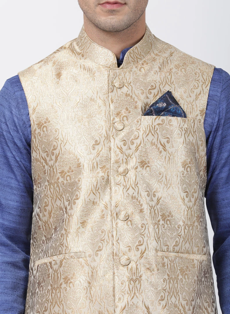Beige Woven Nehru Jacket, Regular style, regular-length, has a Mandarin collar, sleeveless, straight hem, and has three pockets one pocket with a pocket square.