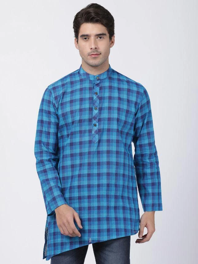 Blue Digitally Printed Checks Kurta, Full Sleeve, Asymmetrical hem, has a Mandarin Collar.