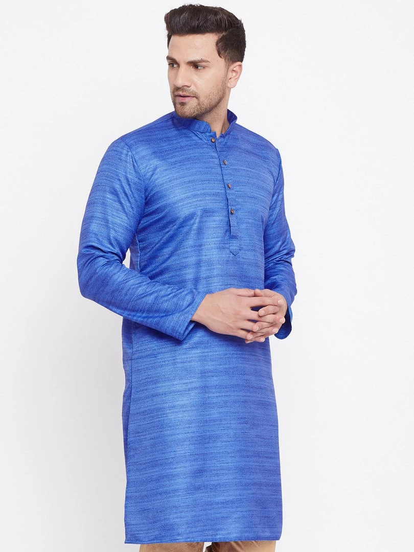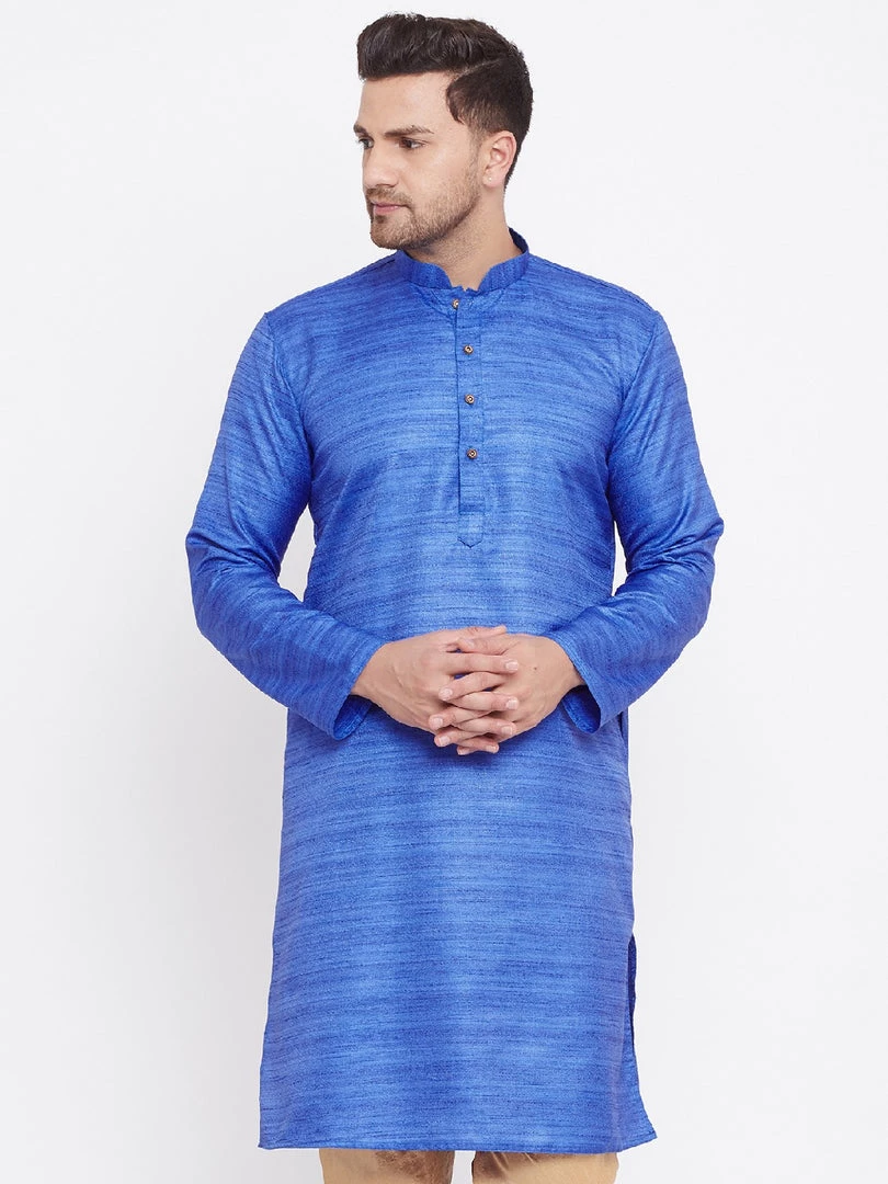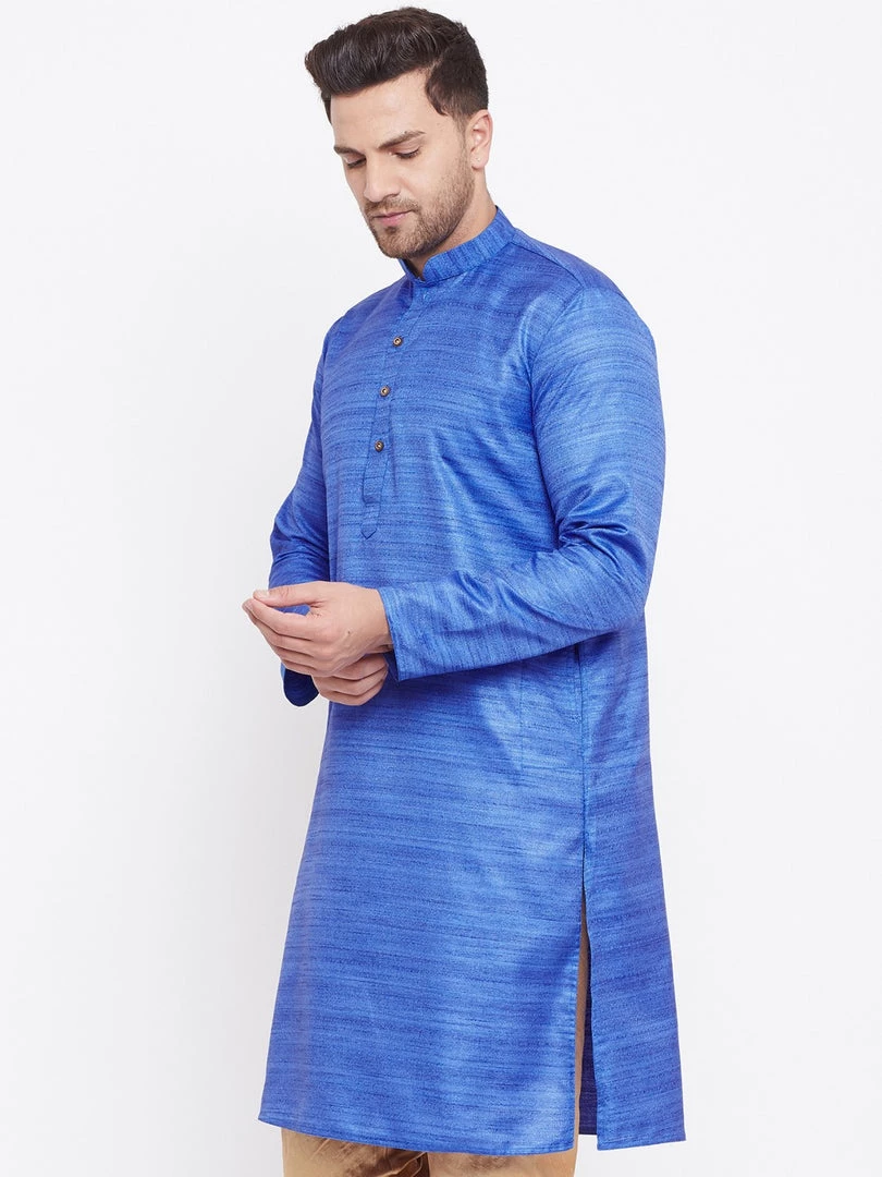 Blue Matka silk straight knee-length kurta in Earthy Colors, has a mandarin collar, button placket, long sleeves, a straight hem, and side slits.