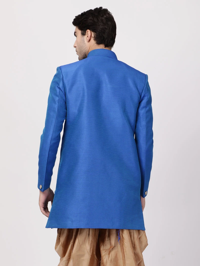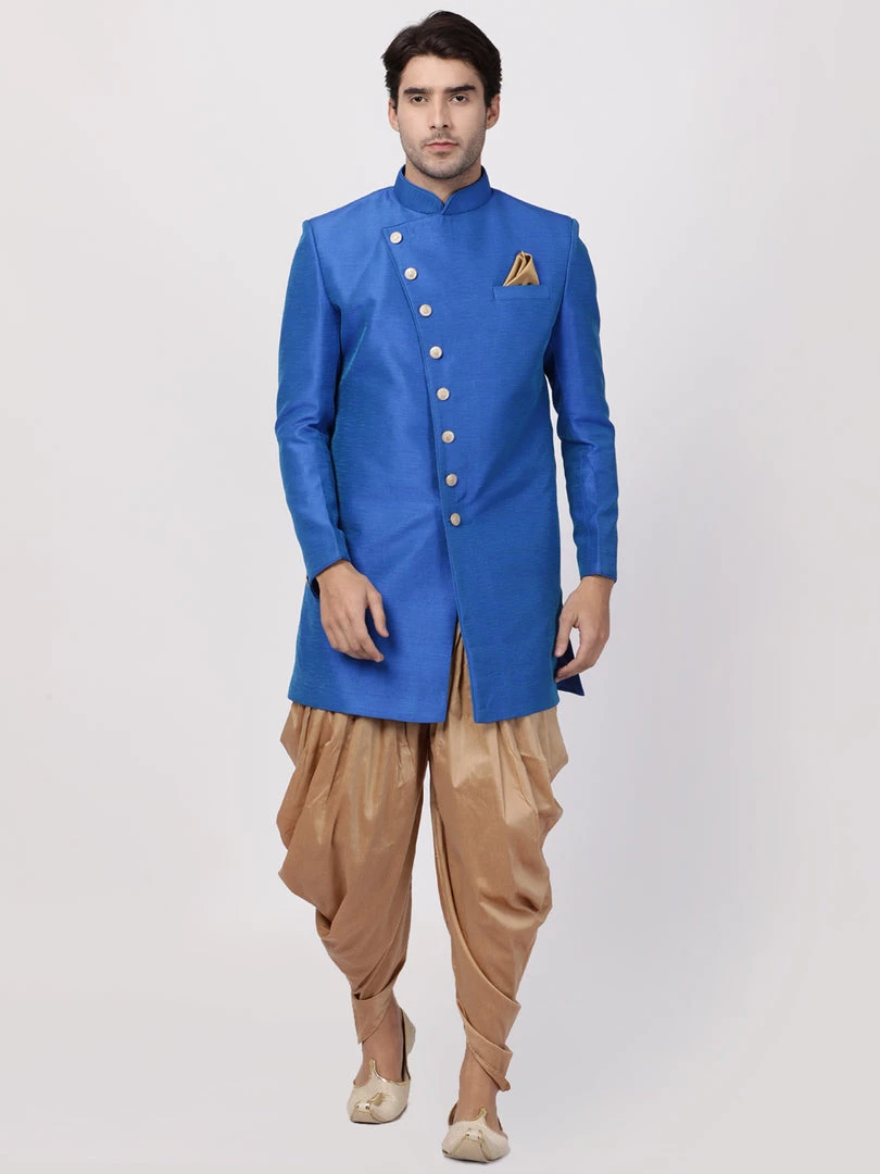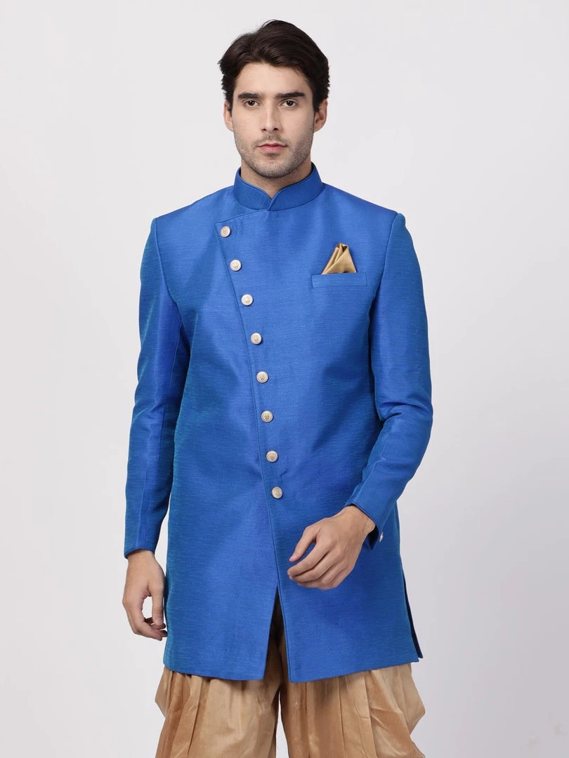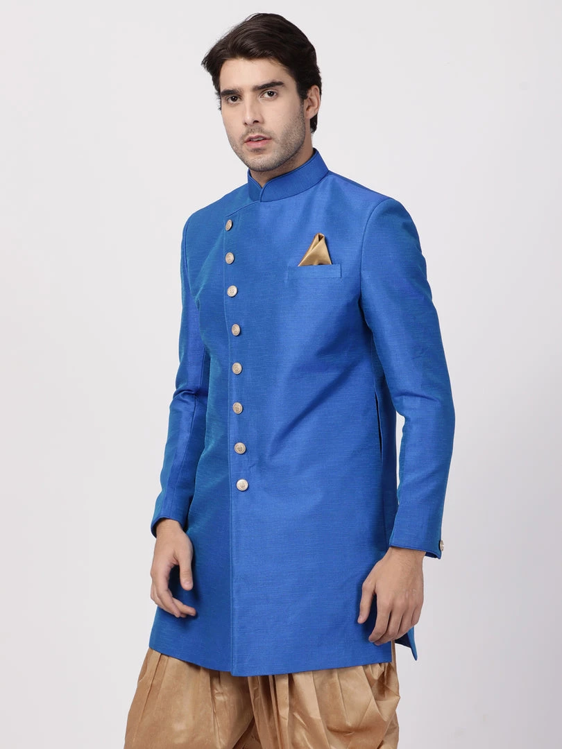 Blue Solid Sherwani, Angrakha style, straight Hip-length Sherwani, has a Mandarin collar, Full Sleeve, Straight hem, and one pocket with a pocket square.