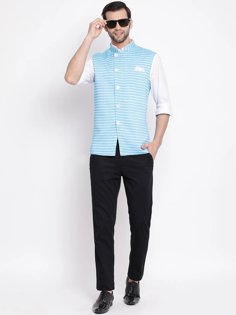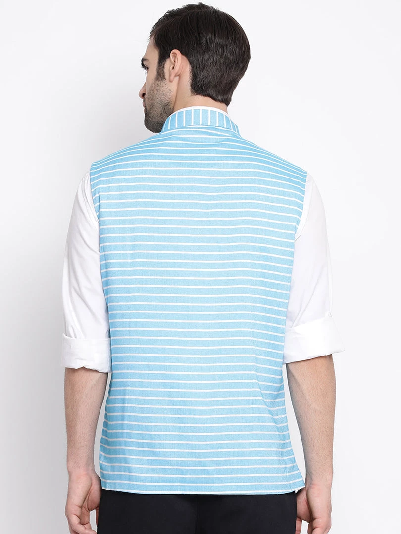 Blue and white woven stripe angrakha style Nehru jacket, has a mandarin collar, a full button placket, sleeveless, a welt pocket