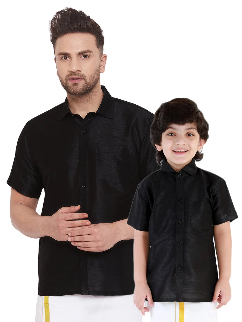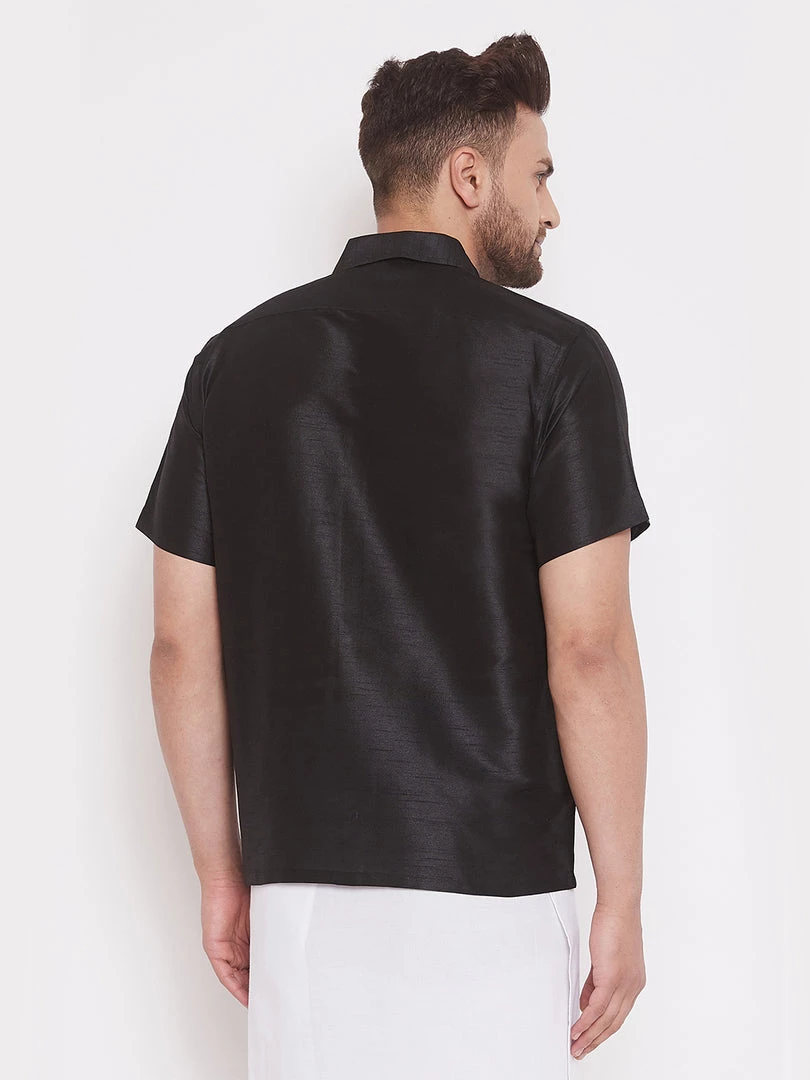 Black solid regular shirt, has a shirt collar, half sleeves, straight hem, full front button placket, side slits and a patch pocket