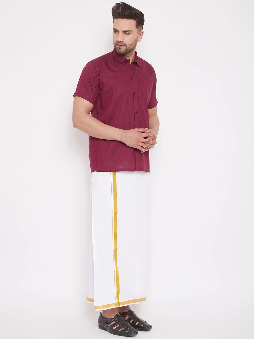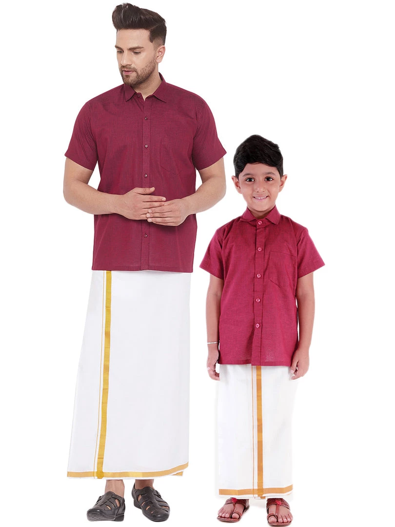 Vastramay Men’s & Boys Maroon Solid Cotton Blend Half Sleeve Ethnic Shirt And Mundu Set Shirt Mundu Set